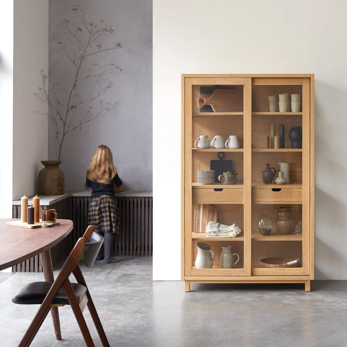 On aime le fond recouvert de cannage, un matériau naturel très en vogue dans les intérieurs contemporains, les portes coulissantes qui optimisent l’espace en gommant l’obligation de laisser de la place pour les portes ouvertes… les tiroirs bien pratiques et la blondeur du bois qui autorise de nombreuses associations de style. Finitions vernies.