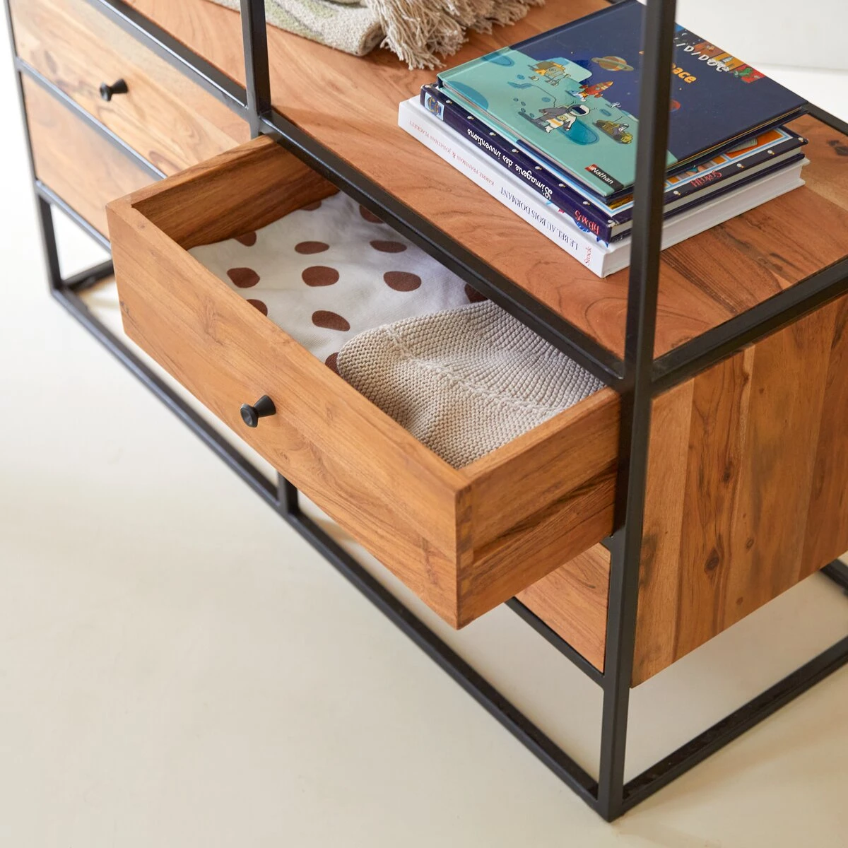 Avec la bibliothèque en acacia massif certifié FSC® et métal Agra, l’imagination est au pouvoir : chasse au trésor dans un pays exotique ou incursion dans l’usine des grands-parents, le choix des rêves est vaste et les aventures nombreuses ! Ranger ses affaires devient un vrai plaisir : on cache les petits trésors dans les tiroirs et on expose les créations issues des mercredis récréatifs ou les jeux de société sur les différentes étagères casiers. Et quand l’enfant organise son univers, il gagne en autonomie… il grandit !