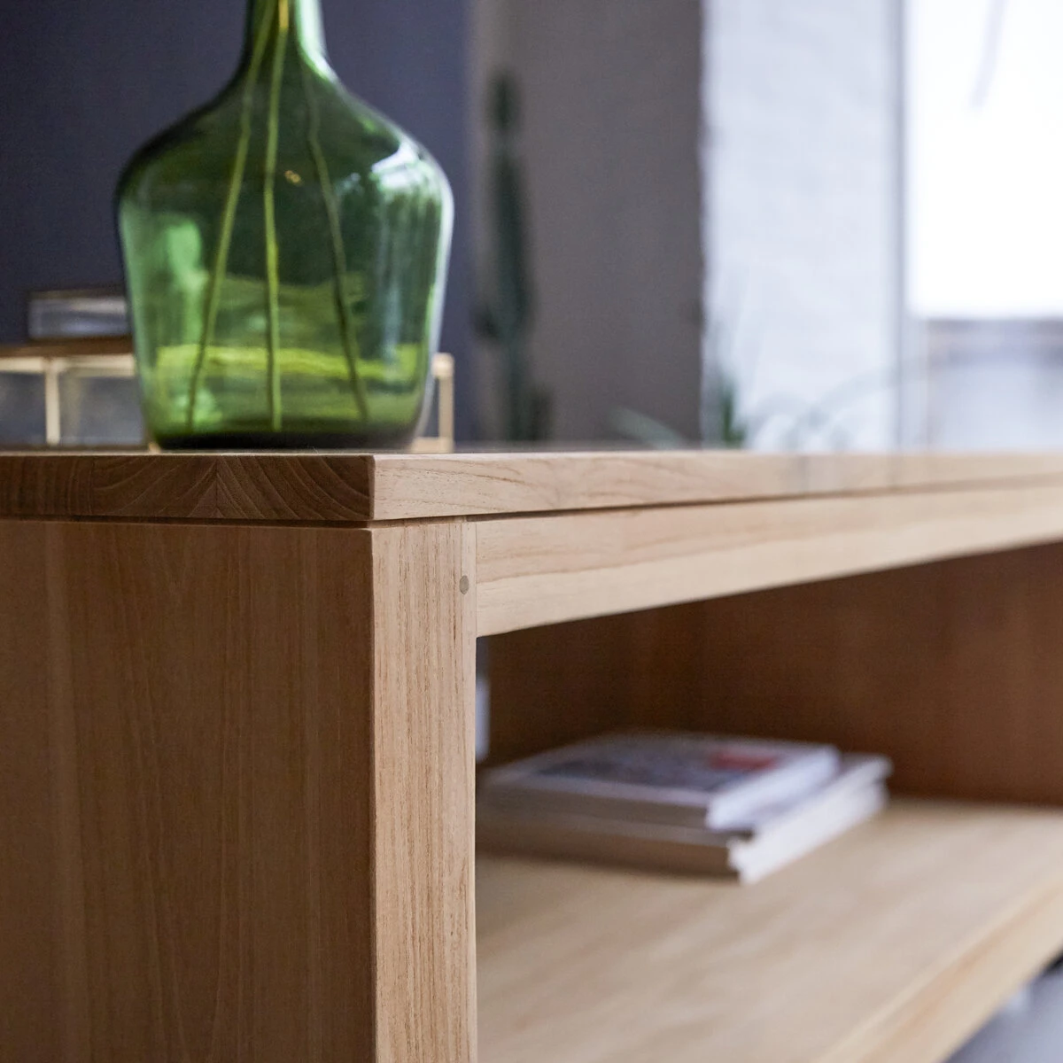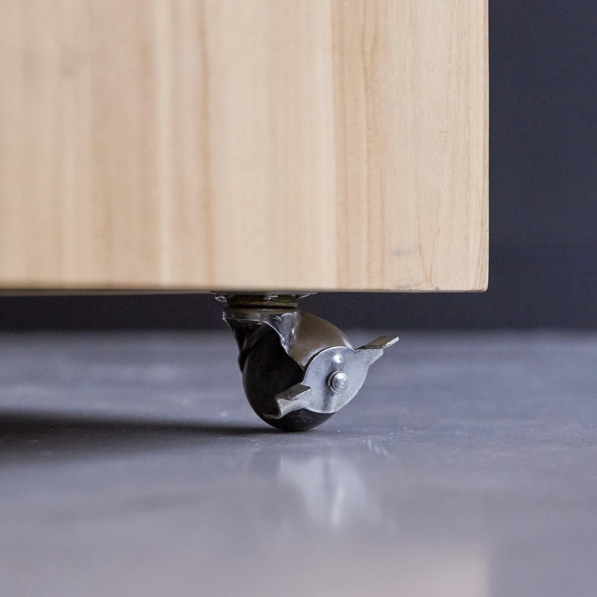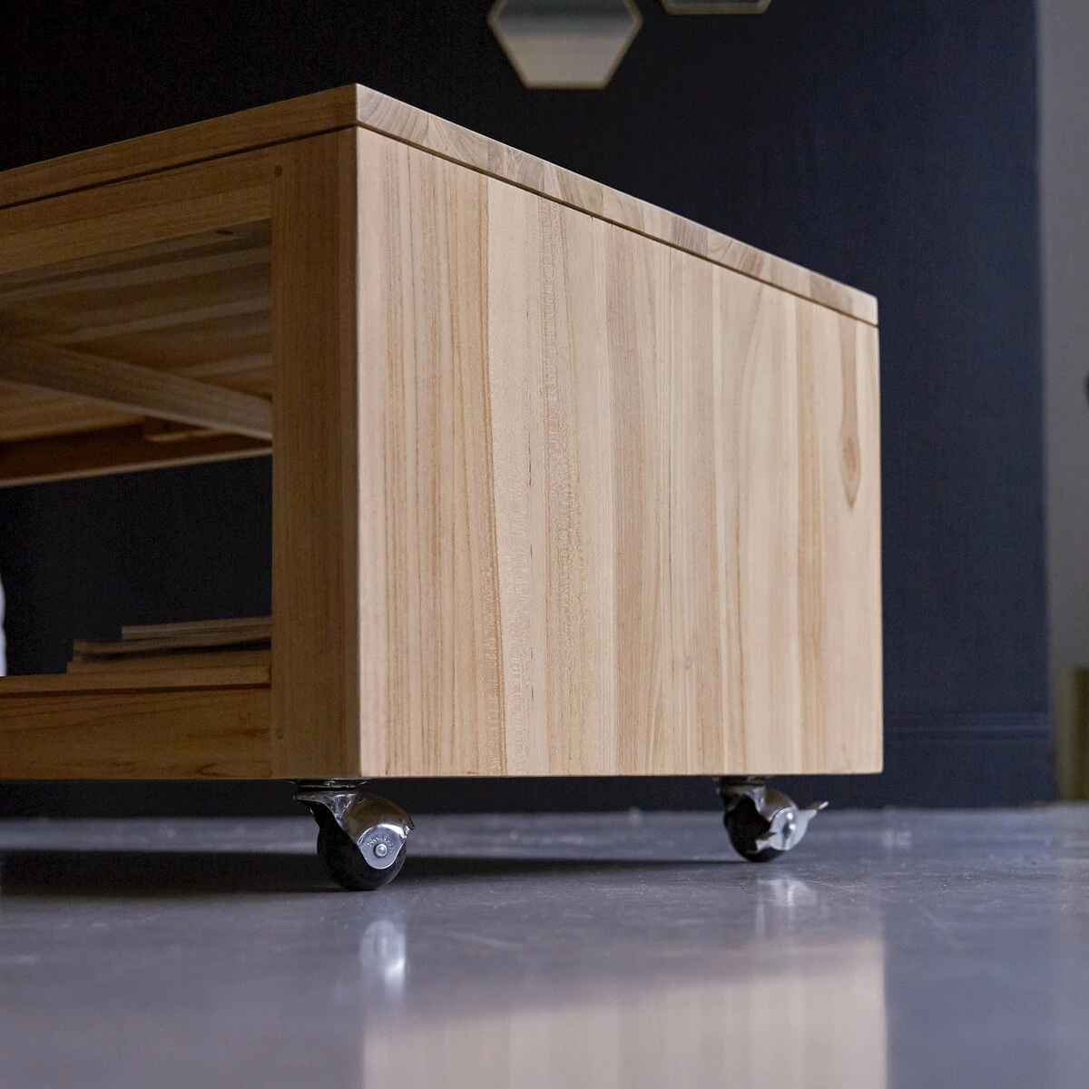 On aime la blondeur de son teck de belle qualité, la perfection de ses lignes épurées et le côté pratique de ses roulettes qui permettent de la déplacer au gré des envies ou des besoins.
