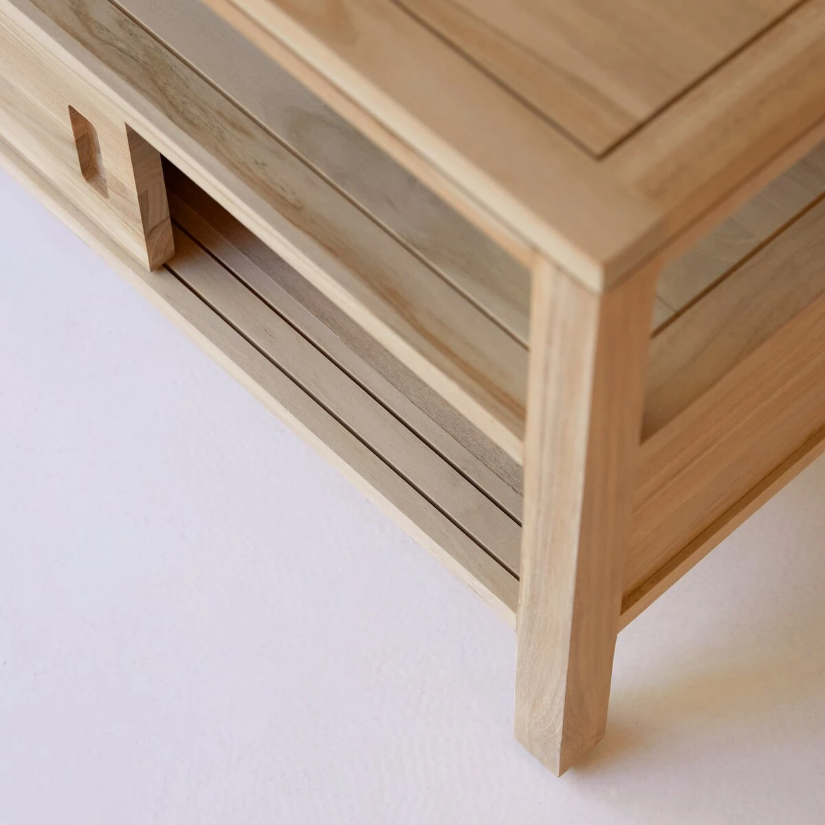 Vous aimerez son style sobre et naturel : un design simple caractérisé par des lignes droites, une teinte claire et une finition naturelle du bois de teck.