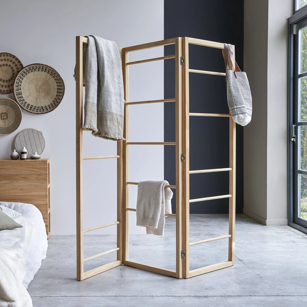 Revu et corrigĂ© dans un esprit minimaliste, le paravent en teck massif 175 Anton trouve sa place partout dans la maison ! Au sĂ©jour ou au salon, il organise l’espace pour composer des zones de vie distinctes : le coin lecture, le coin bureau, le coin tĂ©lĂ©. Dans la chambre, il sĂ©pare le bureau du lit ou symbolise la frontière entre les univers de deux enfants. RĂ©alisĂ© en teck rĂ©sistant Ă l’eau, il est parfait aussi dans la salle de bain pour recevoir serviettes et draps de bain humides, dans une version porte-serviettes très graphique. Modulable, le paravent en teck Anton se plie, se replie, s’étire ou s’étroitise au grĂ© des envies. Â