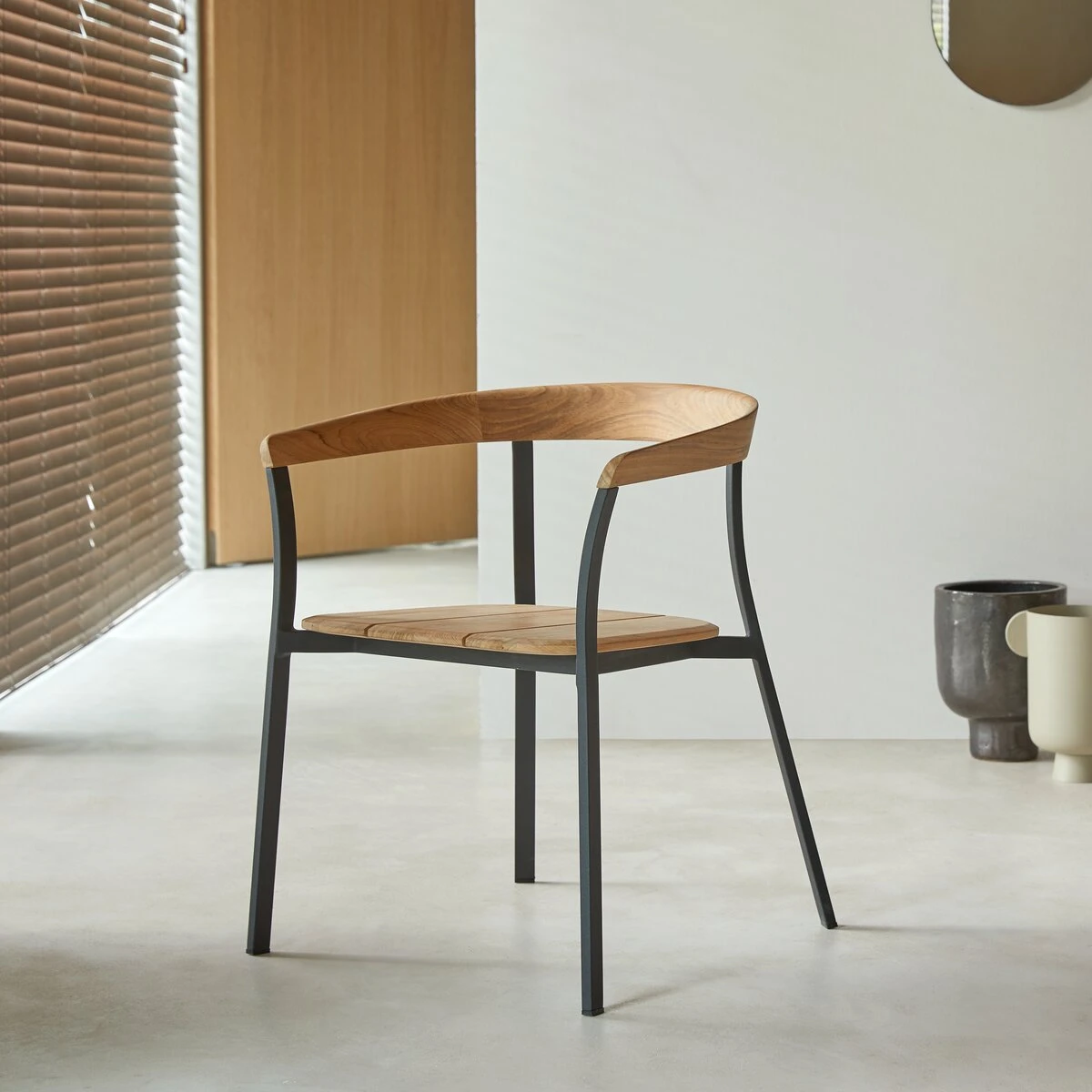 Technicité et bois noble en accord parfait : la chaise en teck massif et aluminium Arco, un meuble haut de gamme au design très réussi ! On aime l’arrondi du dossier obtenu par cintrage du bois – une réalisation technique qualitative – l’apport de l’aluminium qui s’oppose au bois sans l’affronter et la ligne minimaliste. Épurée, cette chaise offre un élégant design contemporain qu’on marie avec brio à la table en teck massif Paloma, version ronde ou ovale ou avec votre table : la blondeur de son essence autorise de nombreuses associations.