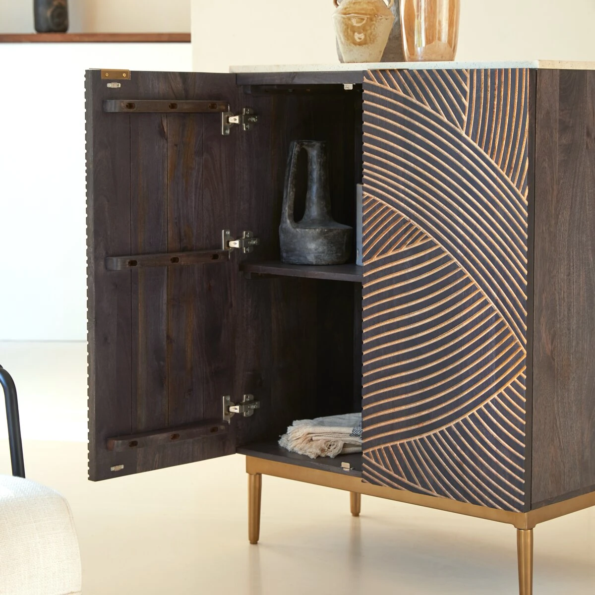 Un meuble comme une pièce de collection : le bahut en manguier massif Bilal séduit par la beauté des sculptures qui en habillent les portes ! Inspiré d’horizons lointains, il confère à votre intérieur un petit air de cabinet de curiosités. On aime son bois massif très emblématique des meubles exotiques, son plateau en terrazzo qui permet de poser des plantes vertes, par exemple, sans craindre d’abîmer le meuble… on aime aussi l’originalité des poignées très discrètes et le piétement aspect laiton qui allège visuellement l’ensemble. Idéal au salon ou au séjour pour organiser la vaisselle ou des accessoires divers, il trouve aussi très naturellement sa place dans une entrée un peu spacieuse. Finition par vernis teinté.