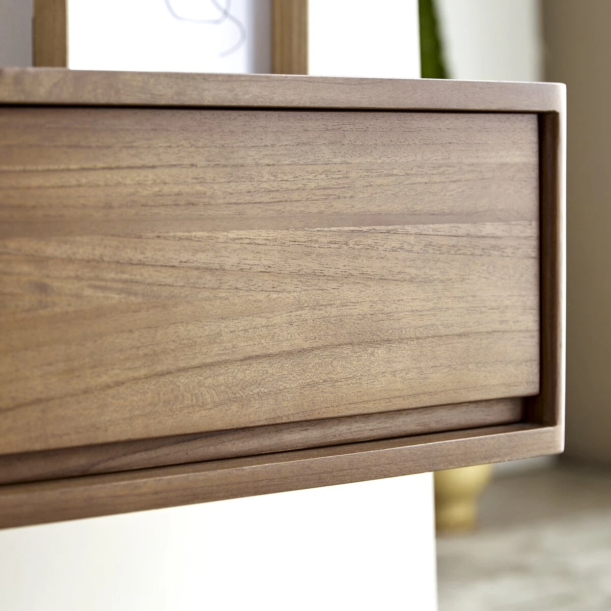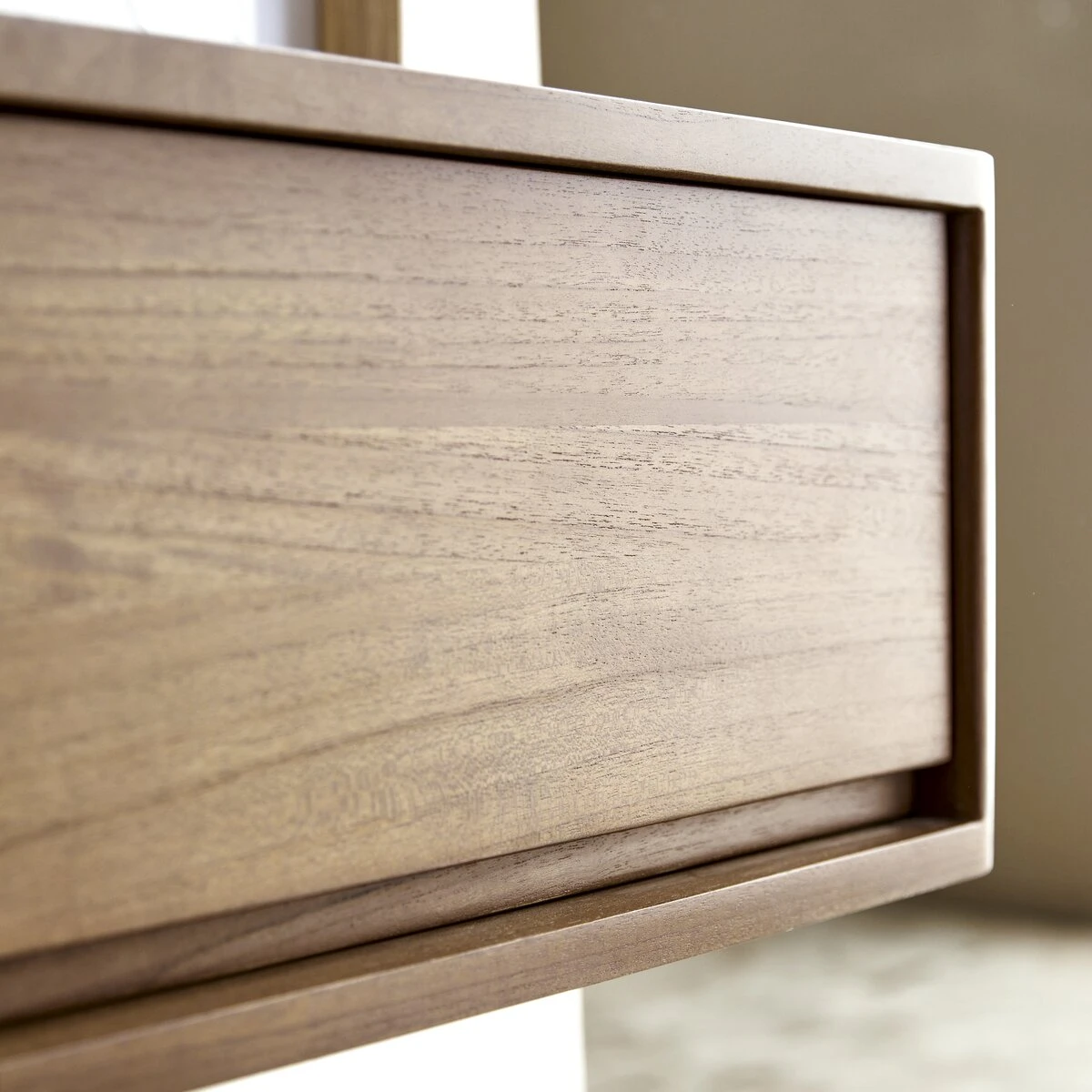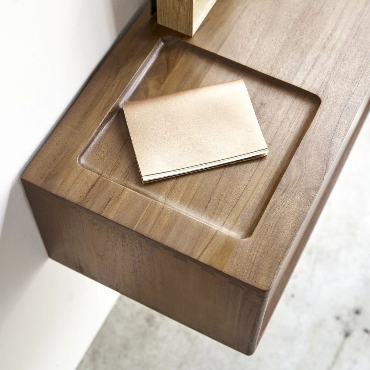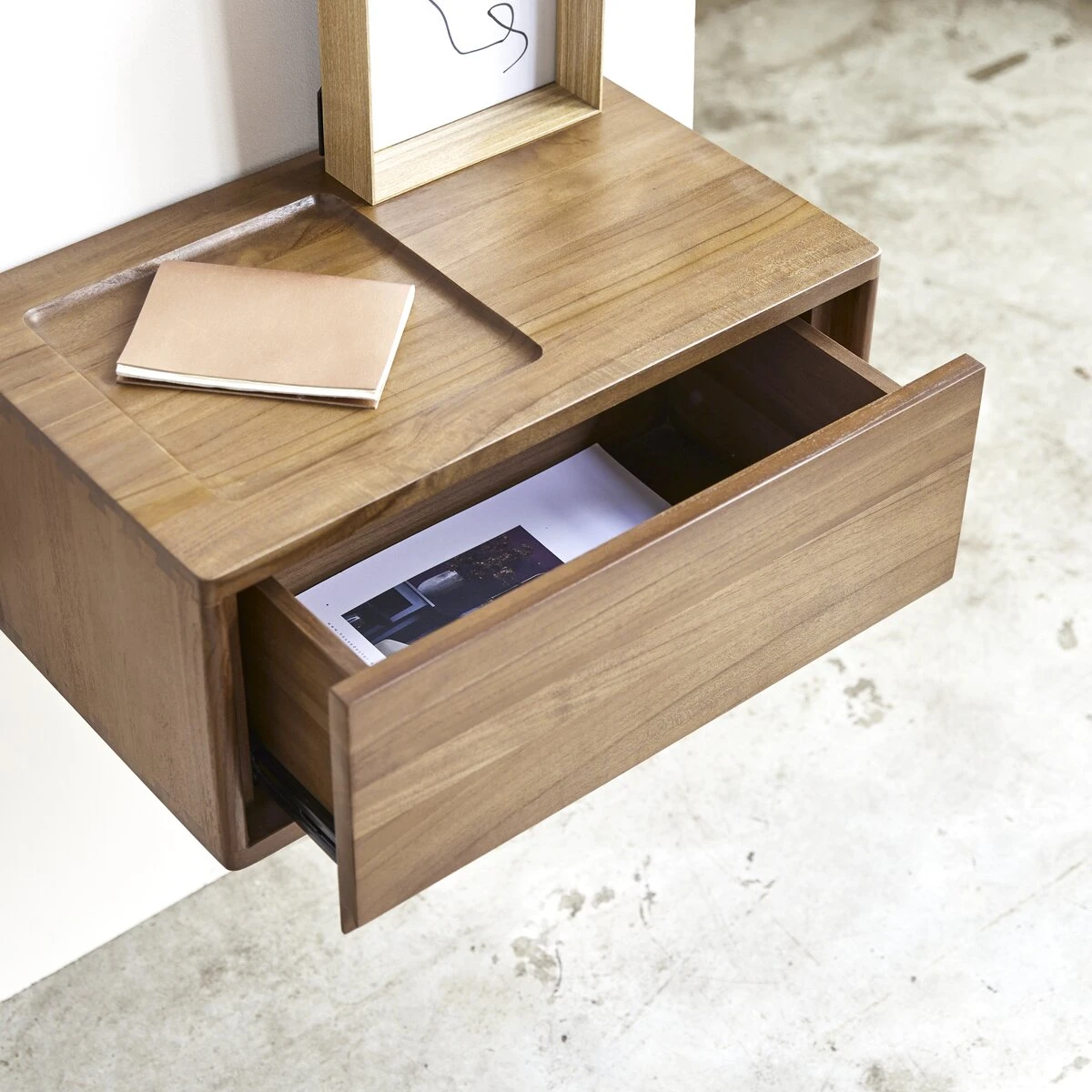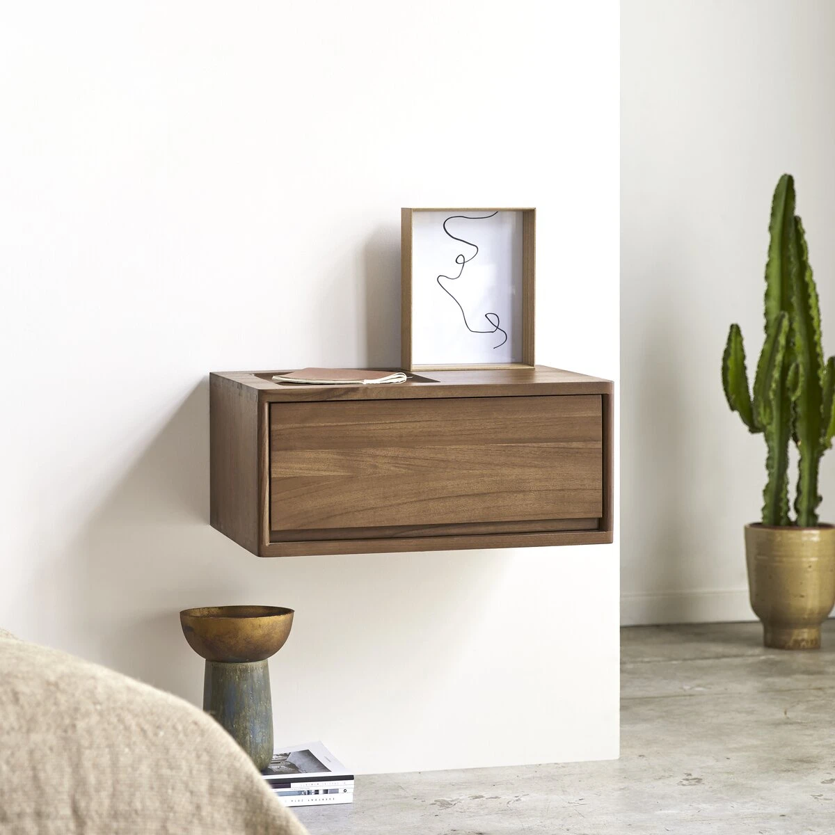 Le chevet suspendu en teck Circa peut être joué seul comme sur notre photo… il peut aussi être associé aux autres meubles de notre collection Circa pour composer un espace de rangement modulable et design.