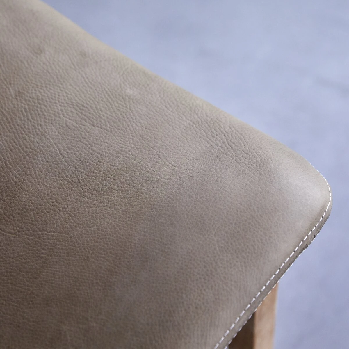 On aime l’alliance des deux matières authentiques, le bois et le cuir, et les angles adoucis.
