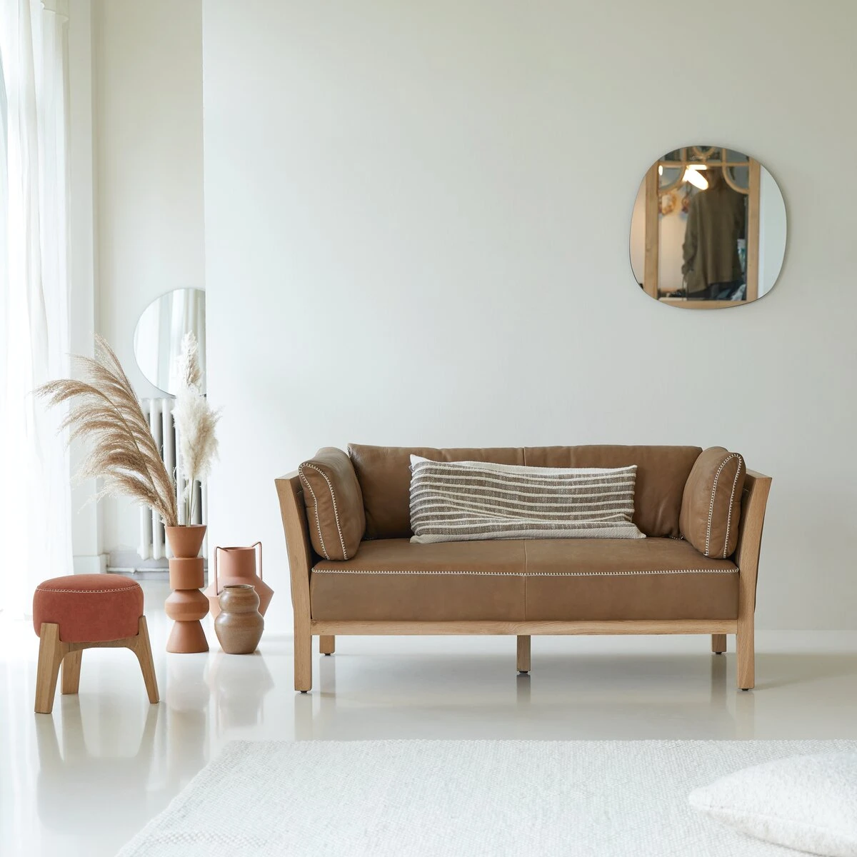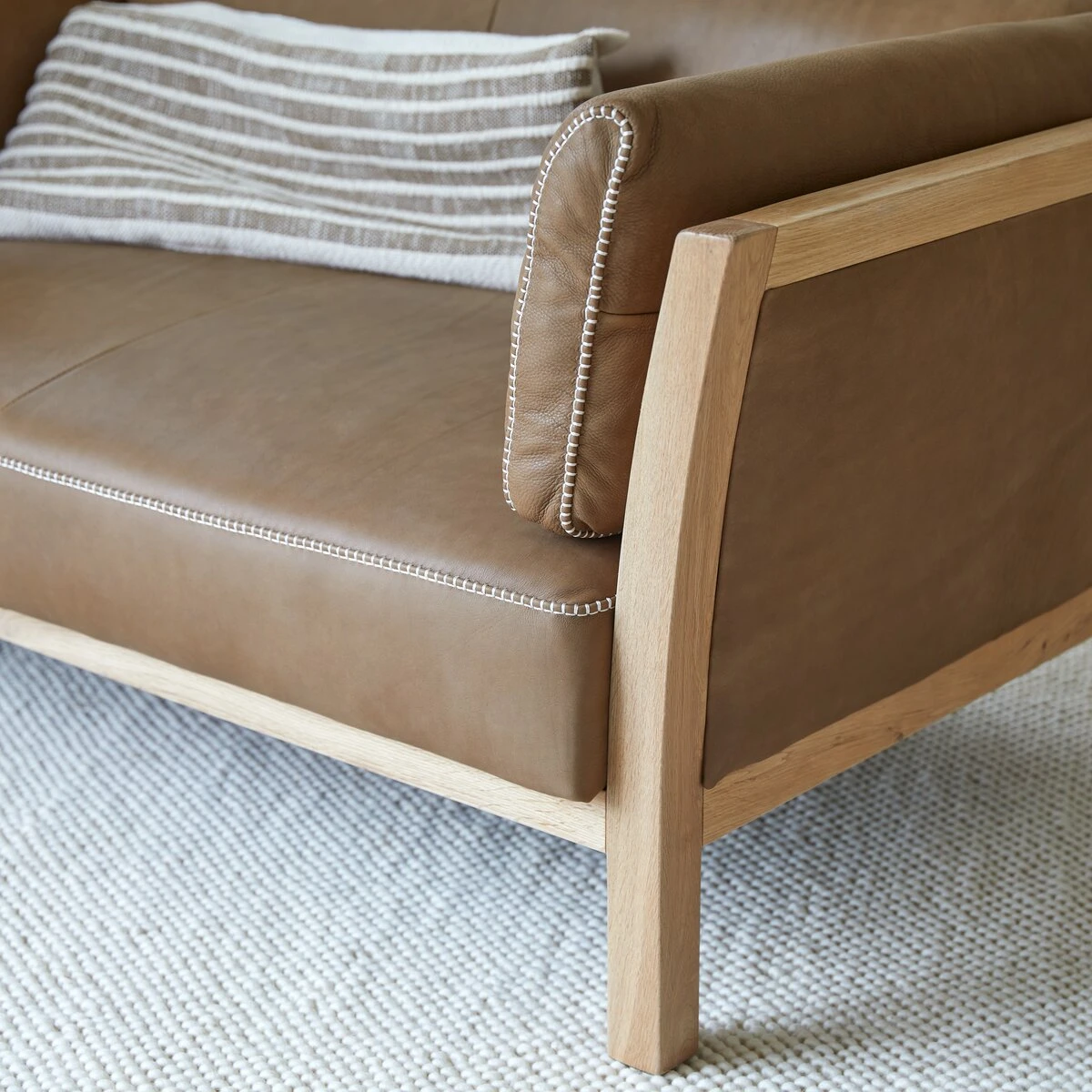 Le cuir cheyenne de très belle qualité offre des coutures apparentes contrastées très remarquées, le piétement en chêne massif brut dessine des lignes sobres et plutôt contemporaines…