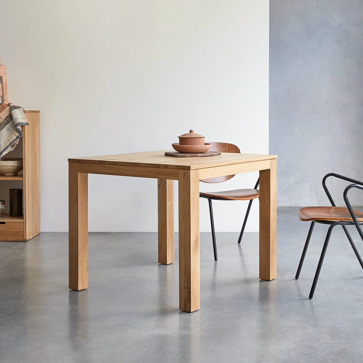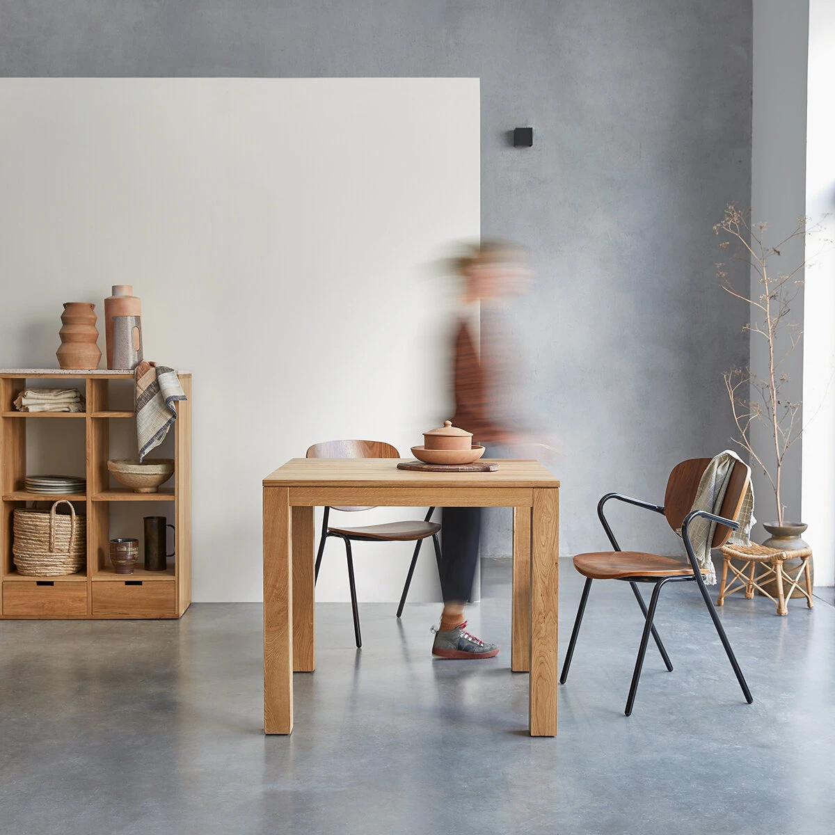 La table en chêne massif Eden affiche de belles qualités : travaillée dans un chêne massif certifié FSC® (l’assurance qu’il provient de forêts gérées de manière responsable), elle est fabriquée en Europe et offre une conception astucieuse. Sa forme carrée et ses pieds situés aux angles permettent de recevoir 2 à 4 personnes parfaitement installées : les pieds ne gênent pas l’assise, particulièrement appréciable pour les repas ou les sessions de jeux de société !