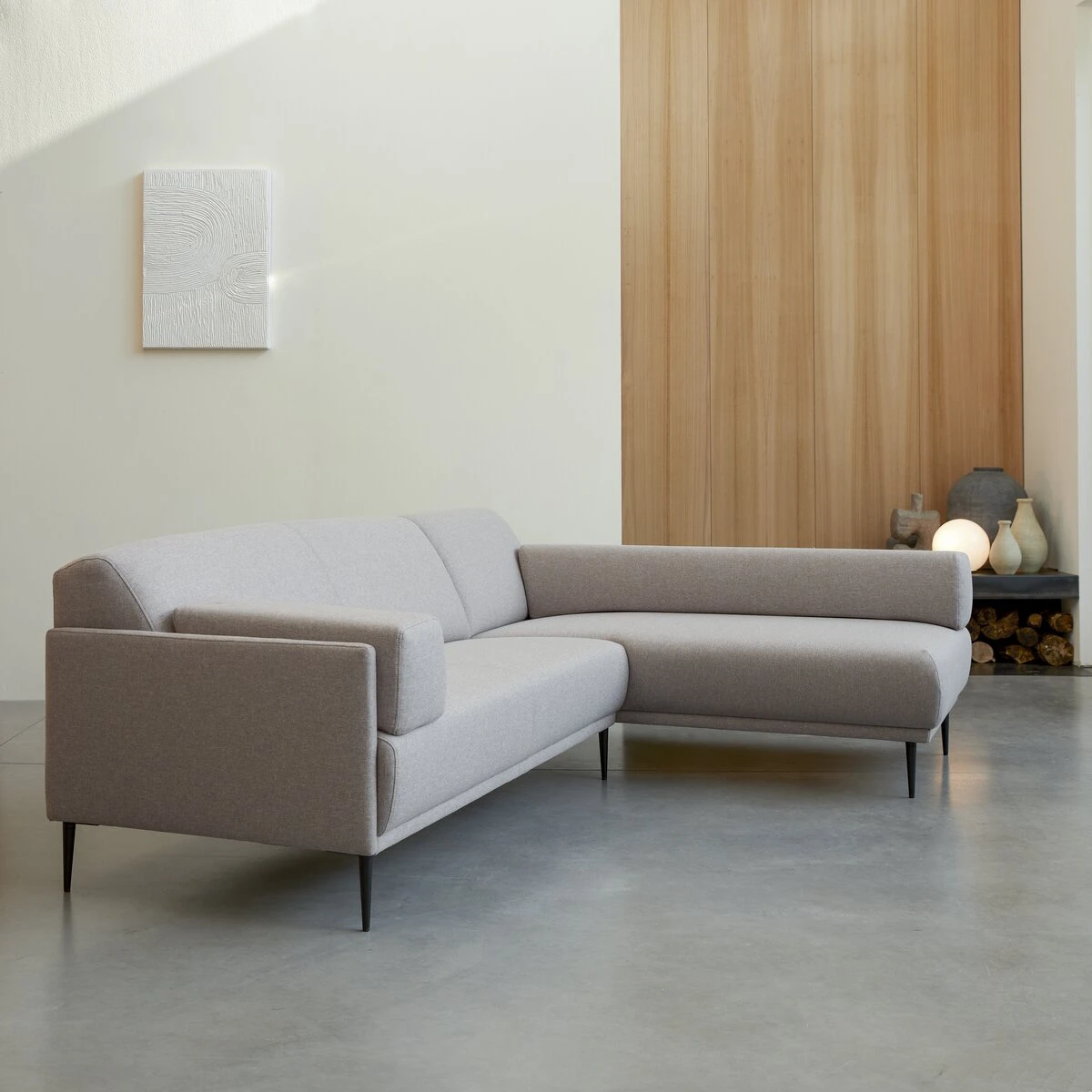 Sobriété de lignes et élégance contemporaine pour le canapé d’angle droit Finn qui se métamorphose au gré de vos envies… En effet, selon que vous laissiez les coussins d’accoudoir ou non, le design du canapé est tout à fait différent : ultra minimaliste sans, cosy avec. Travaillé dans un tissu certifié OEKO-TEX®, ce qui garantit l’absence de substances ou de produits chimiques nocifs, il est idéal pour de longues soirées conviviales. Pièce maîtresse de votre salon, il se marie avec tout style de déco intérieure : la sobriété de sa ligne et l’élégance naturelle de son coloris gris permettent toutes les interprétations. A noter, les esthétiques pieds en métal, suffisamment hauts pour permettre à un balai de se glisser sous le meuble.