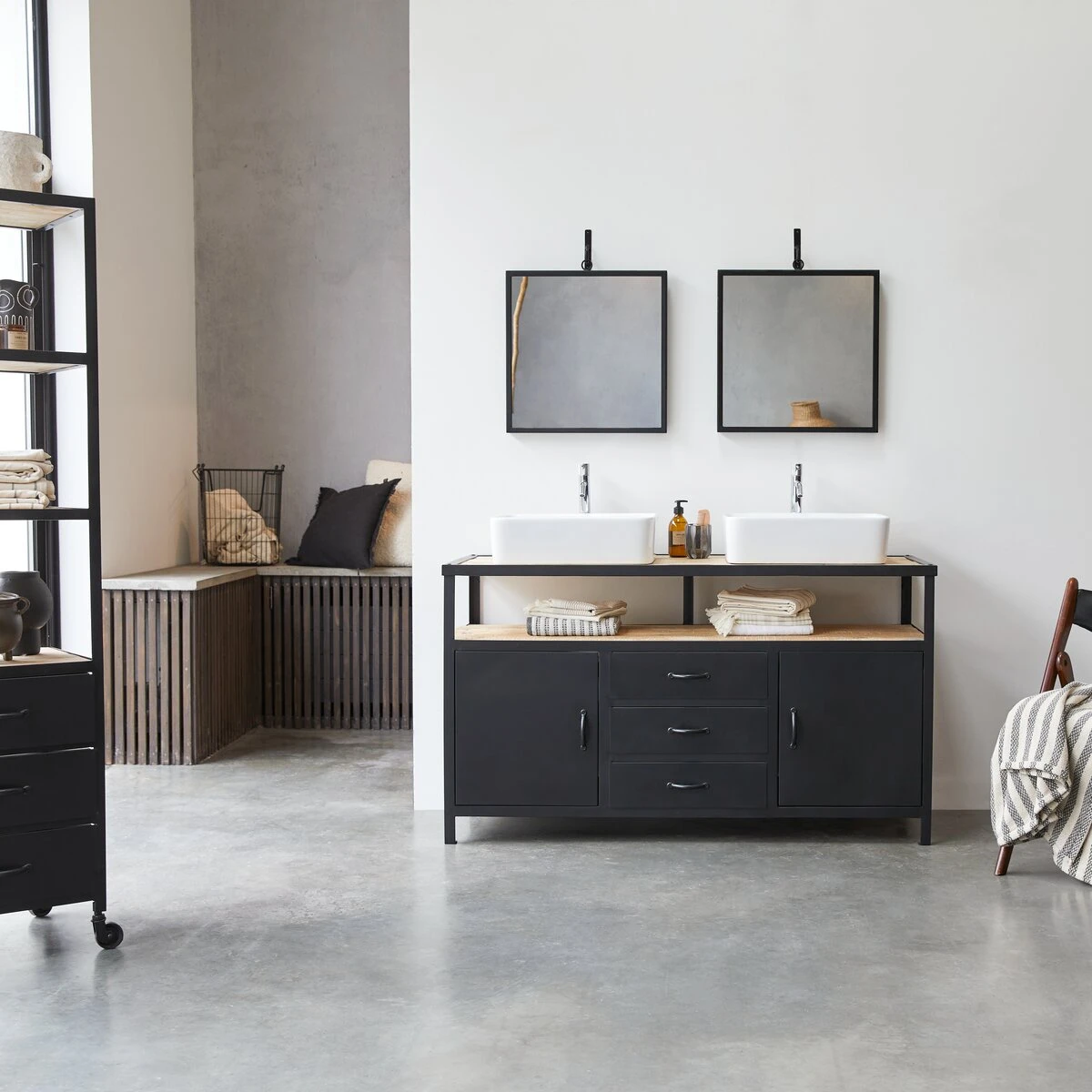 La salle de bain ne fait pas exception à cette irrépressible envie de vintage : ce meuble en métal et plateau manguier massif est prévu pour recevoir deux vasques. Très bien conçu, il offre de nombreux espaces de rangement et existe aussi en version simple vasque.