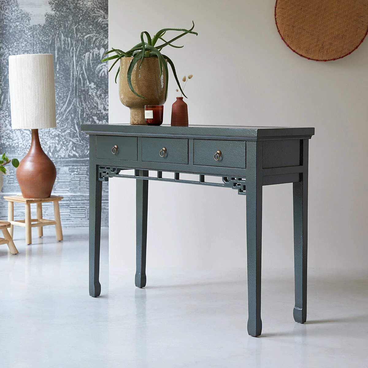 Munie de 3 tiroirs, cette console sera utile au salon comme dans une chambre ou comme desserte d’entrée. Son coloris sobre vous permettra de l’associer aisément avec votre intérieur.