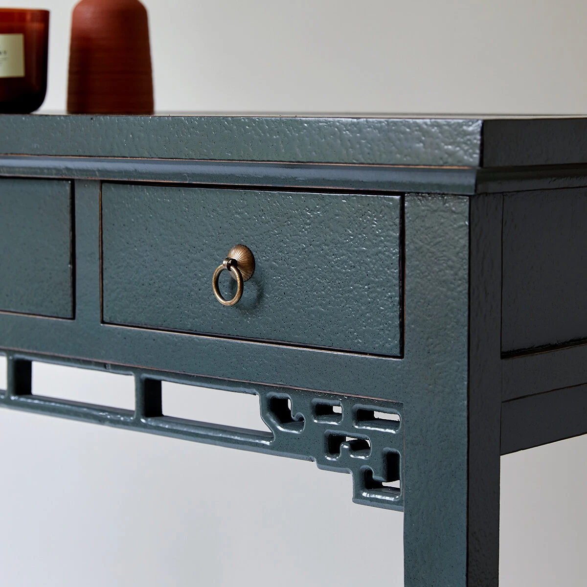 Console en pin à la finition vieillie, ce meuble d’entrée chinois ravira les amateurs d’antiquités. Sa finition patinée, témoin du temps qui passe, lui donne charme et originalité.