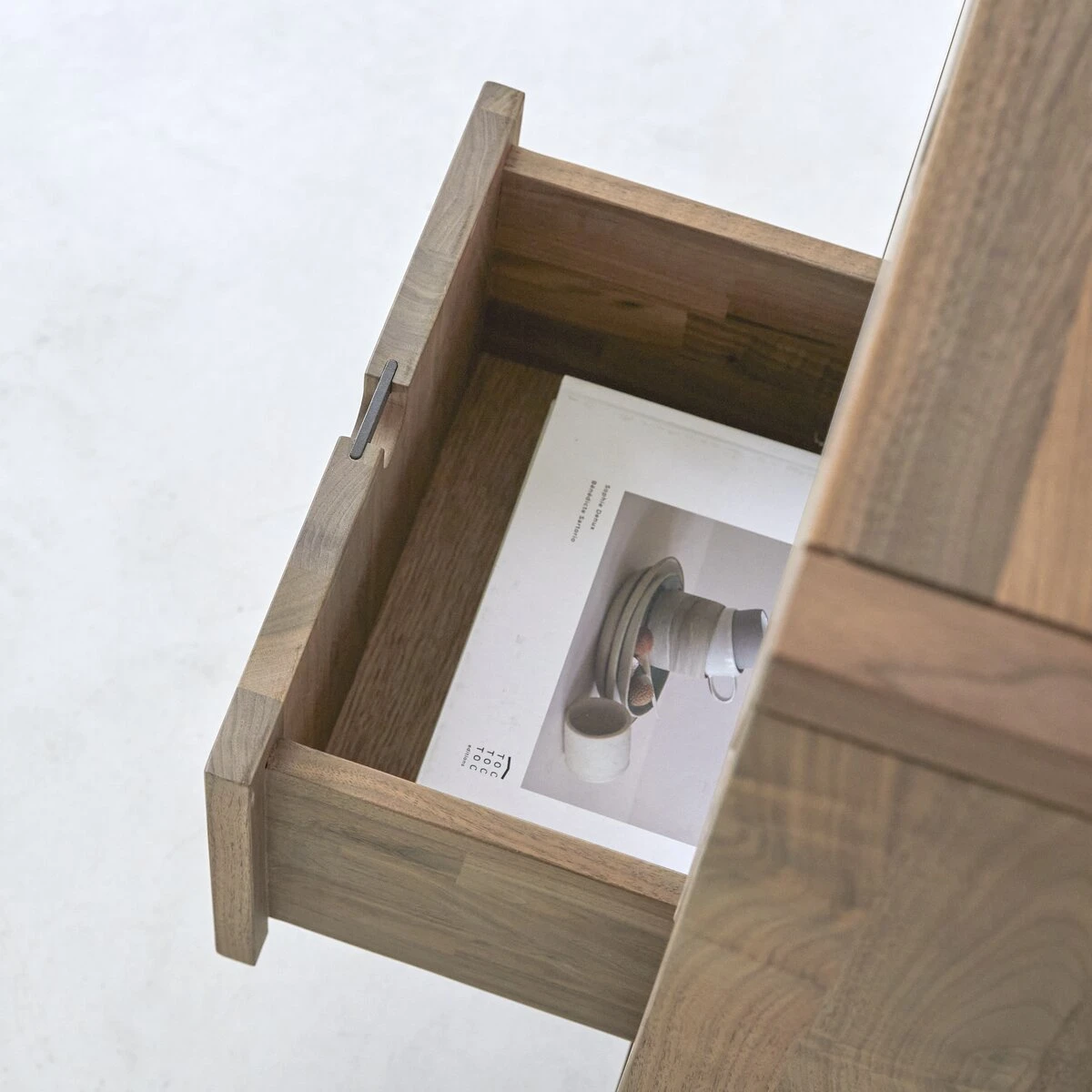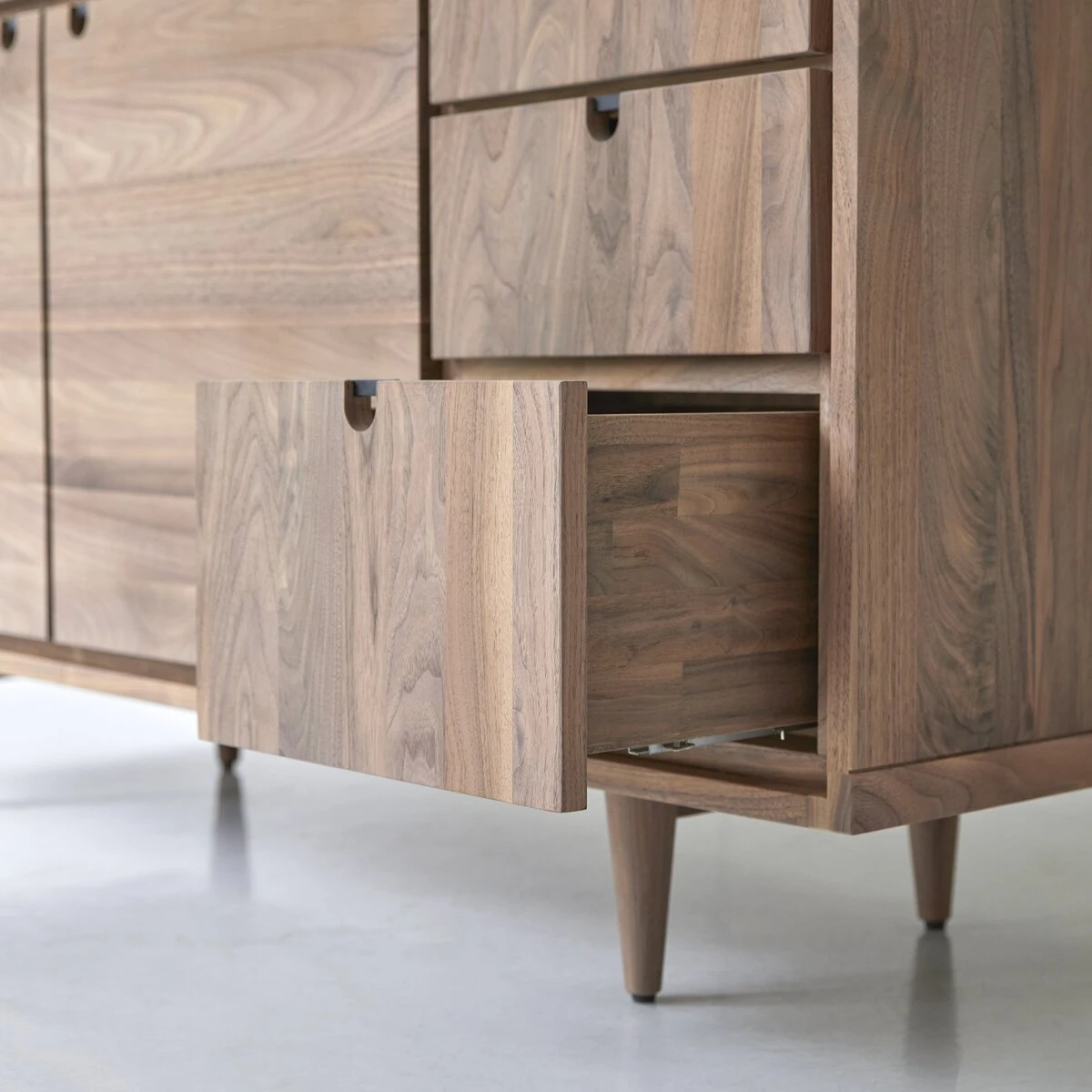 D’inspiration scandinave, le buffet en noyer massif Jonàk séduit surtout par la qualité de son bois noble et ses magnifiques reflets mordorés. On aime aussi le veinage apparent très graphique, la finition mate, la belle capacité de rangement et la ligne épurée. Idéal dans le séjour pour ranger vaisselle et linge de table, il est également parfait dans une grande cuisine ou un salon spacieux.