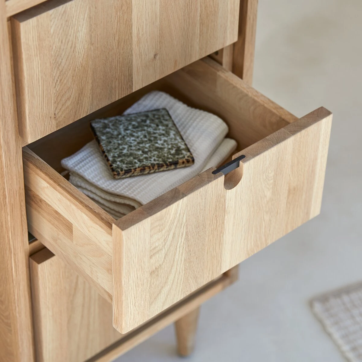La colonne de salle de bain en chêne massif Jonàk conjugue esprit scandinave très affirmé et belle capacité de rangement pour un encombrement minimum au sol. Dans la partie supérieure fermée par une porte, on range le linge de toilette et dans les trois tiroirs les flacons et autres accessoires de beauté. La niche du milieu peut aussi recevoir des serviettes élégamment pliées ou de jolis objets déco.