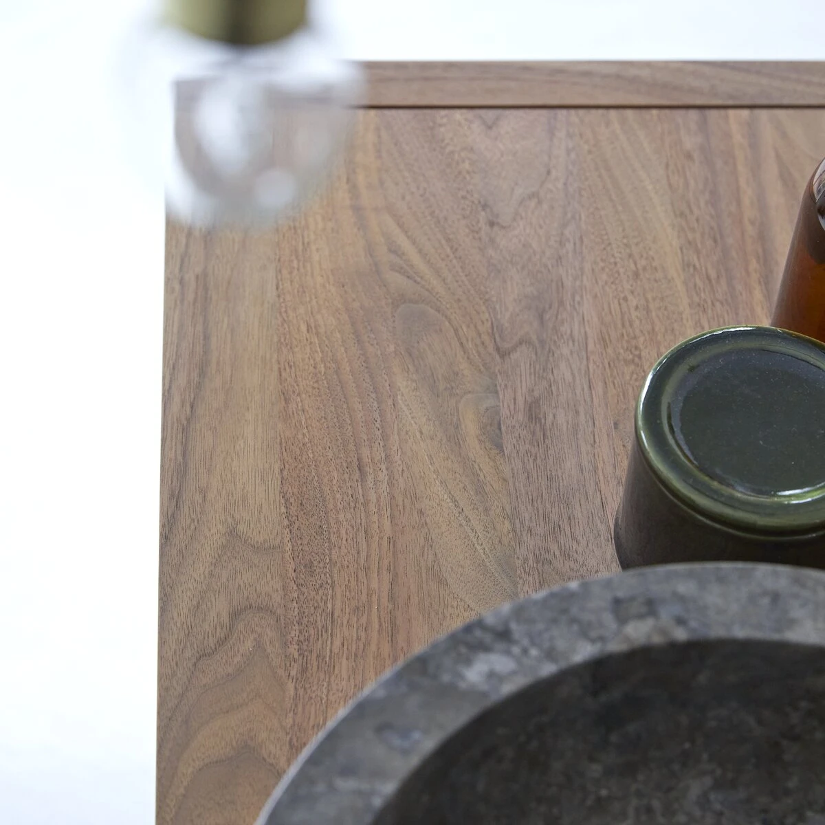Le meuble sous vasque en noyer Jonàk est présenté ici avec la vasque Bahya Grey. Découvrez notre gamme complète de vasques à poser en marbre, terrazzo …