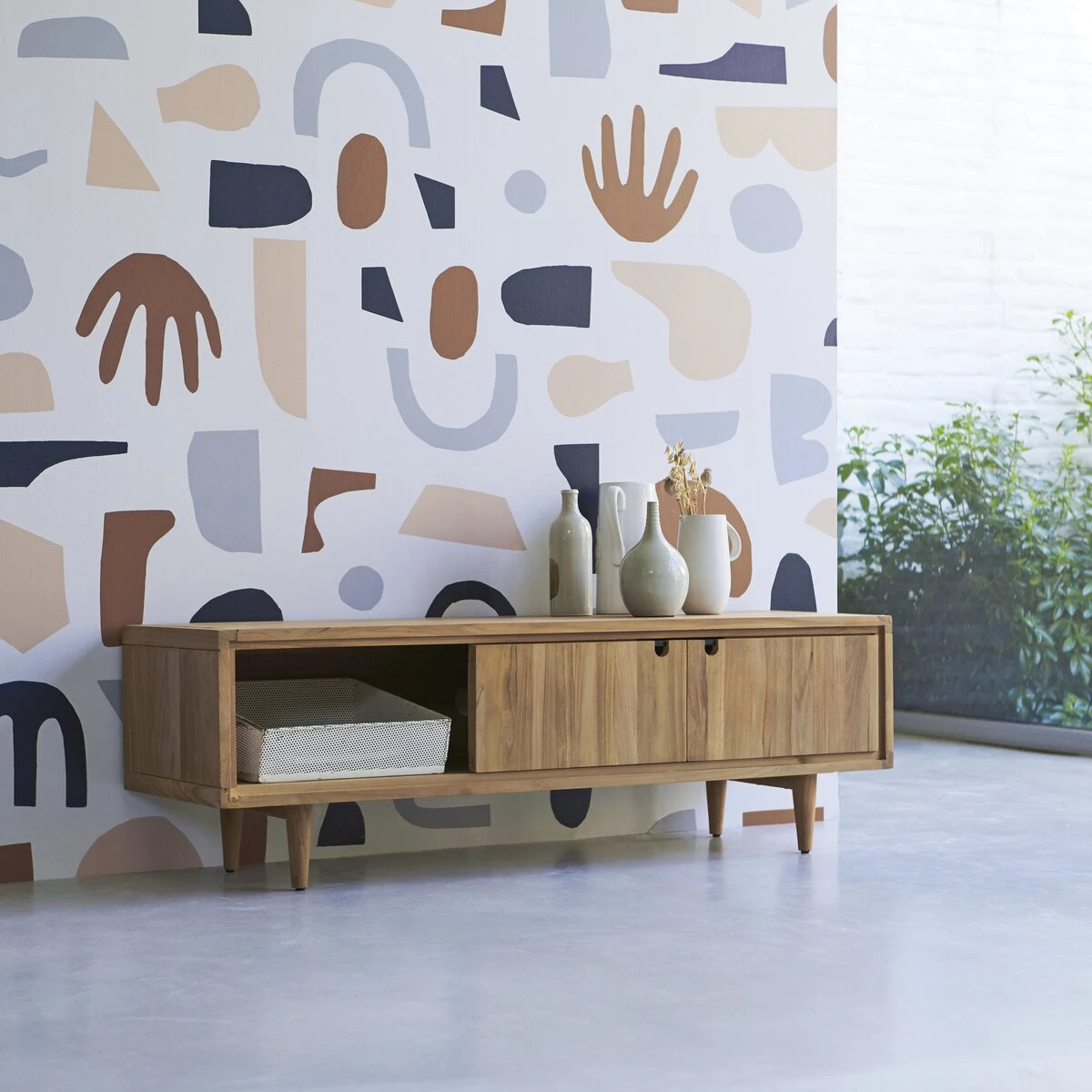 Notre meuble TV Jonàk est fabriqué en teck massif brut naturel. Véritable meuble de rangement, ses 2 portes coulissantes et sa niche vous permettront de mettre à disposition tous le nécessaire de votre pièce. Il trouvera facilement sa place au salon comme au séjour, ce meuble de télévision en teck apportera une touche moderne à votre intérieur.
