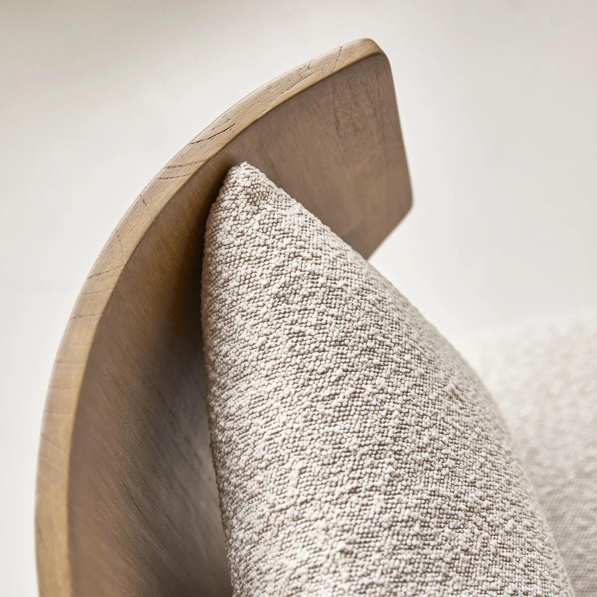 Une allure contemporaine, un design de caractère, une inspiration africaine : le fauteuil June en mindi massif et tissu bouclé ne passe pas inaperçu ! Plein de charme, il confère beaucoup de personnalité à votre salon. Confortable, il offre une assise profonde, une belle tenue et un dossier en bois, très graphique et remarquablement visuel. Ses courbes arrondies, son bois clair et son coloris écru permettent de le combiner facilement à vos meubles existants en apportant une petite touche contemporaine bien en vue. Idéal au salon, dans une chambre ou le bureau… il compose un lieu unique et plein de personnalité associé à un autre fauteuil aux allures singulières comme le fauteuil Boti ou le fauteuil Pera. Le coussin du dos est amovible. Le piètement est verni pour être facile à vivre au quotidien.
