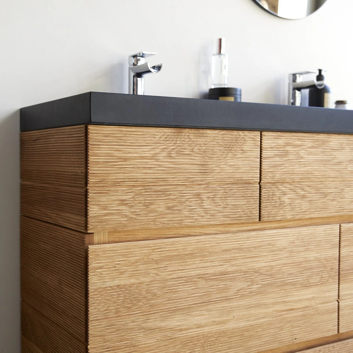 Découvrez notre meuble sous vasque Karl Duo en chêne massif certifié FSC® et plateau en pierre de lave. Parfait meuble de rangement, il est équipé de 4 tiroirs qui vous permettront de mettre à disposition votre linge de maison et vos produits de beauté. Gain de place optimal : 2 en 1, grâce à son large plan vasque est idéal pour une salle de bain familiale.