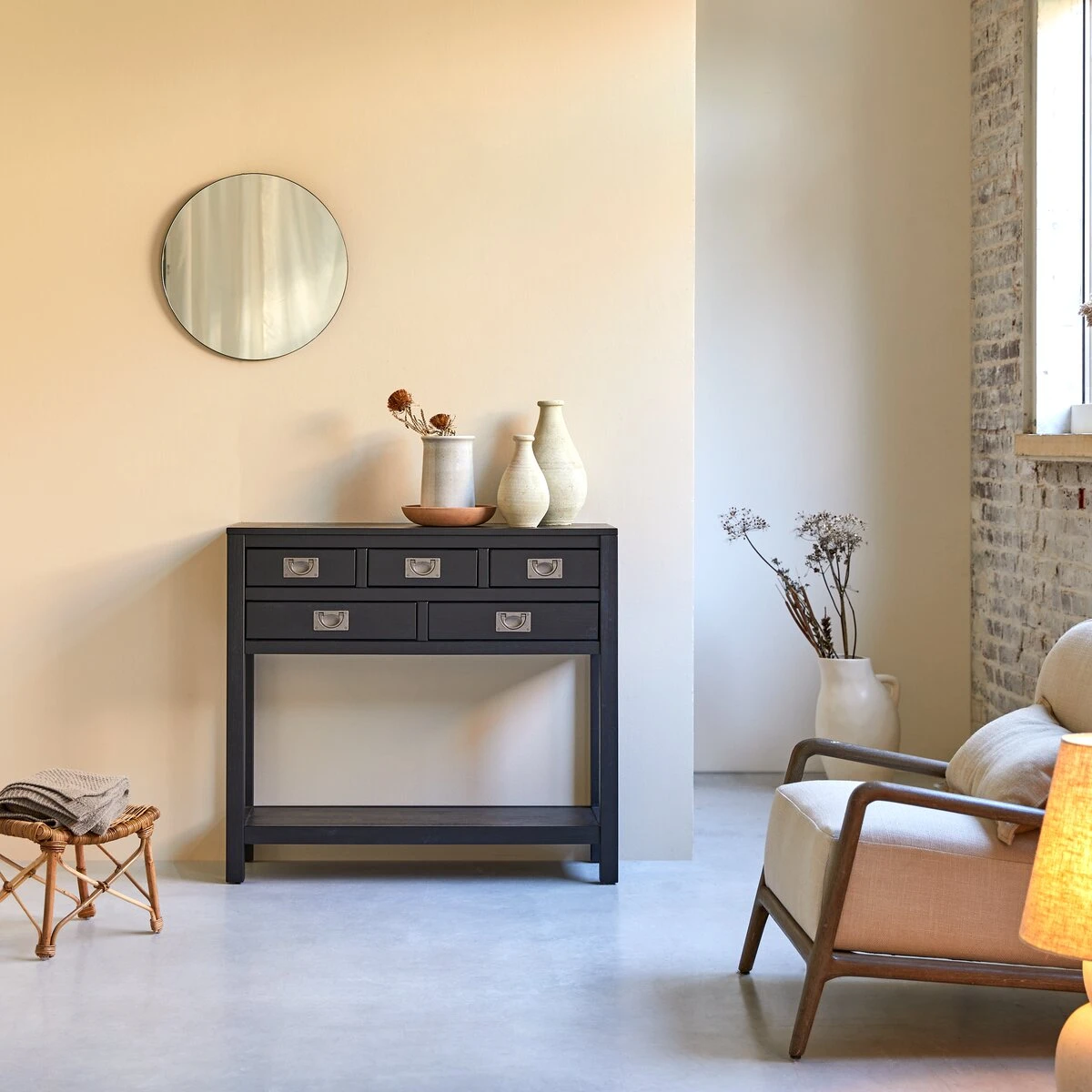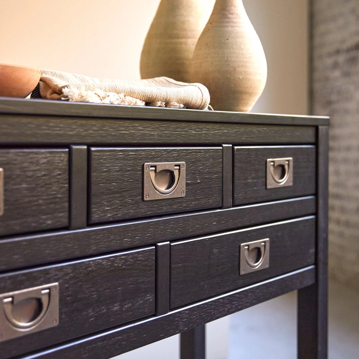 Un design qui vogue entre esprit industriel et inspiration exotique pour la console en pin massif Klaten. On aime son petit côté meuble d’apothicaire à 5 tiroirs, bien pratique pour ranger avec élégance le linge de table, les couverts ou tous ces petits objets qui n’ont jamais de place définie. Idéale dans toute la maison, cette console habille une cloison dans le séjour, complète le salon ou accueille vos visiteurs dans l’entrée ou un couloir. Elle trouve aussi avec bonheur sa place dans la chambre pour jouer les coiffeuses stylées ou recevoir le téléviseur… Bref, un joli meuble qui habille avec personnalité toutes les pièces de la maison !
