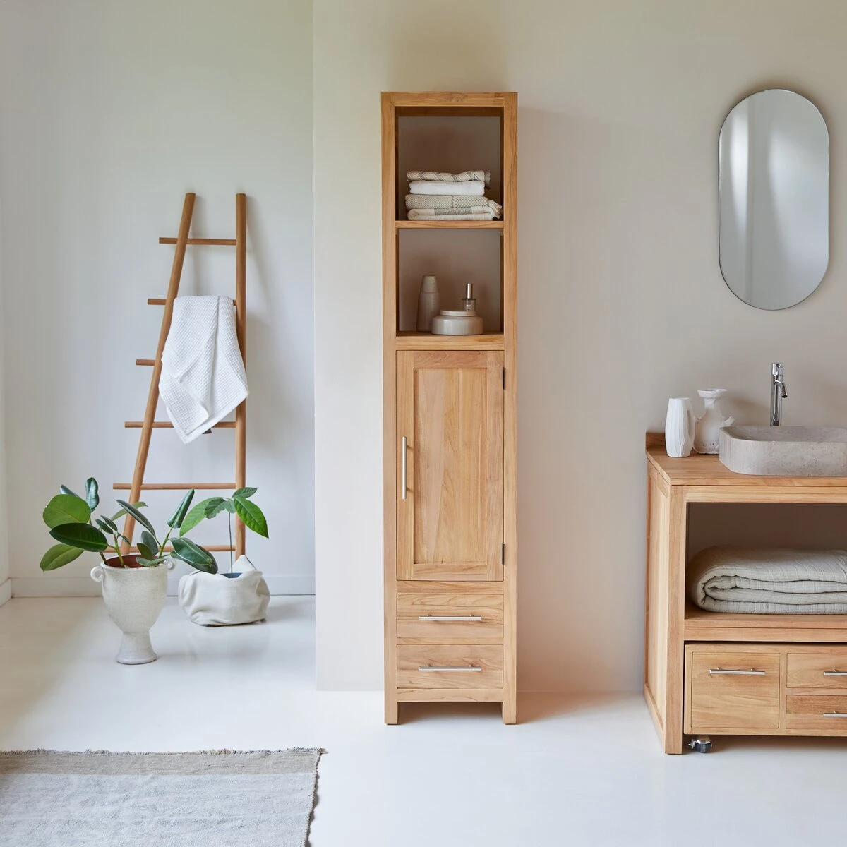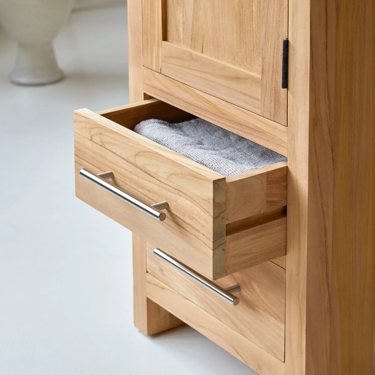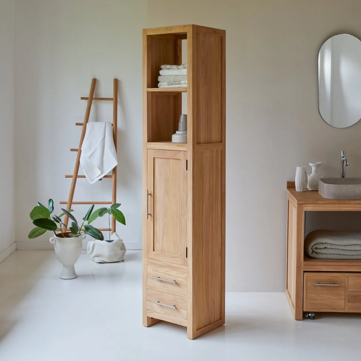 Grande colonne de salle de bain en teck brut. Ce meuble de rangement est composĂ© de 2 niches supĂ©rieures, d’une porte ouvrant sur 2 niveaux et de 2 tiroirs.