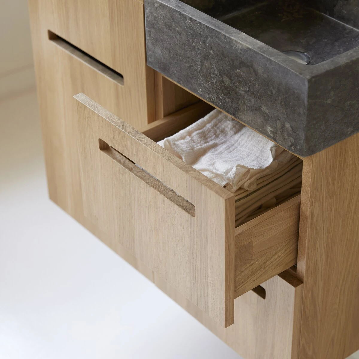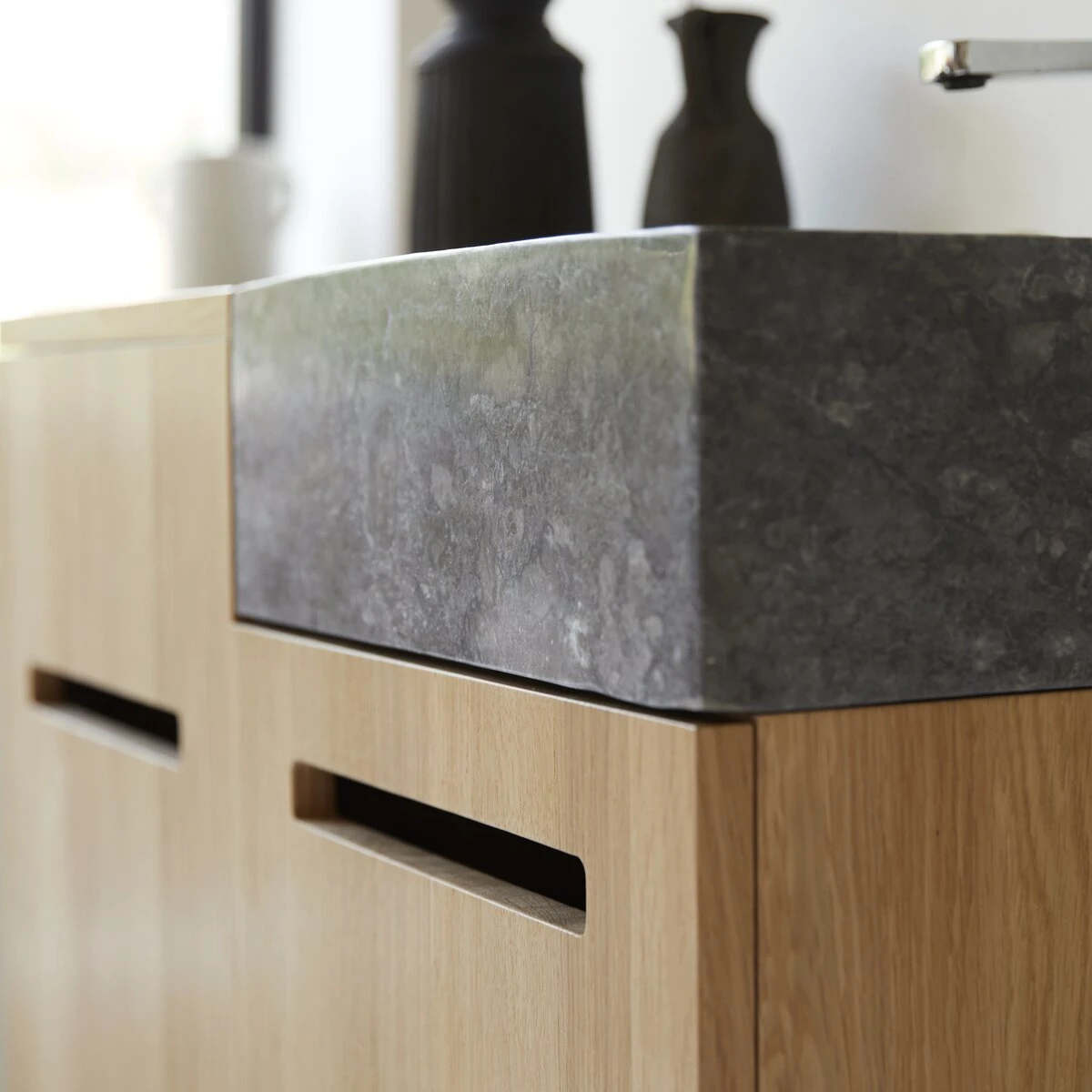 Quand deux matières nobles, durables et faciles à vivre au quotidien s’allient pour composer un meuble élégant, pratique et résistant : le meuble de salle bain Line en chêne massif et marbre vous séduira à coup sûr ! Suspendu, il allège visuellement l’espace, redessine les proportions de la salle de bain en donnant de la profondeur et permet un nettoyage facile puisque le dessous du meuble est accessible. Bien conçu, il offre une belle capacité de rangement pour organiser linge de toilette et produits d’hygiène et compose aussi un cabinet de toilette complet dans une chambre.
