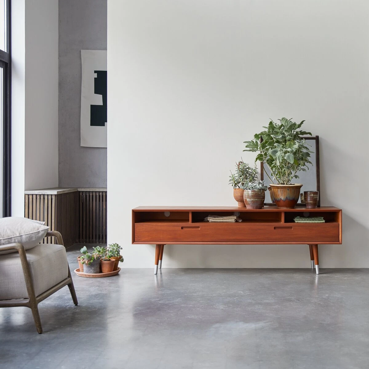 Esprit vintage et inspiration scandinave trĂšs rĂ©ussis pour ce meuble TV en bois d’acajou massif certifiĂ© FSCŸ 180 Magda 50âs !