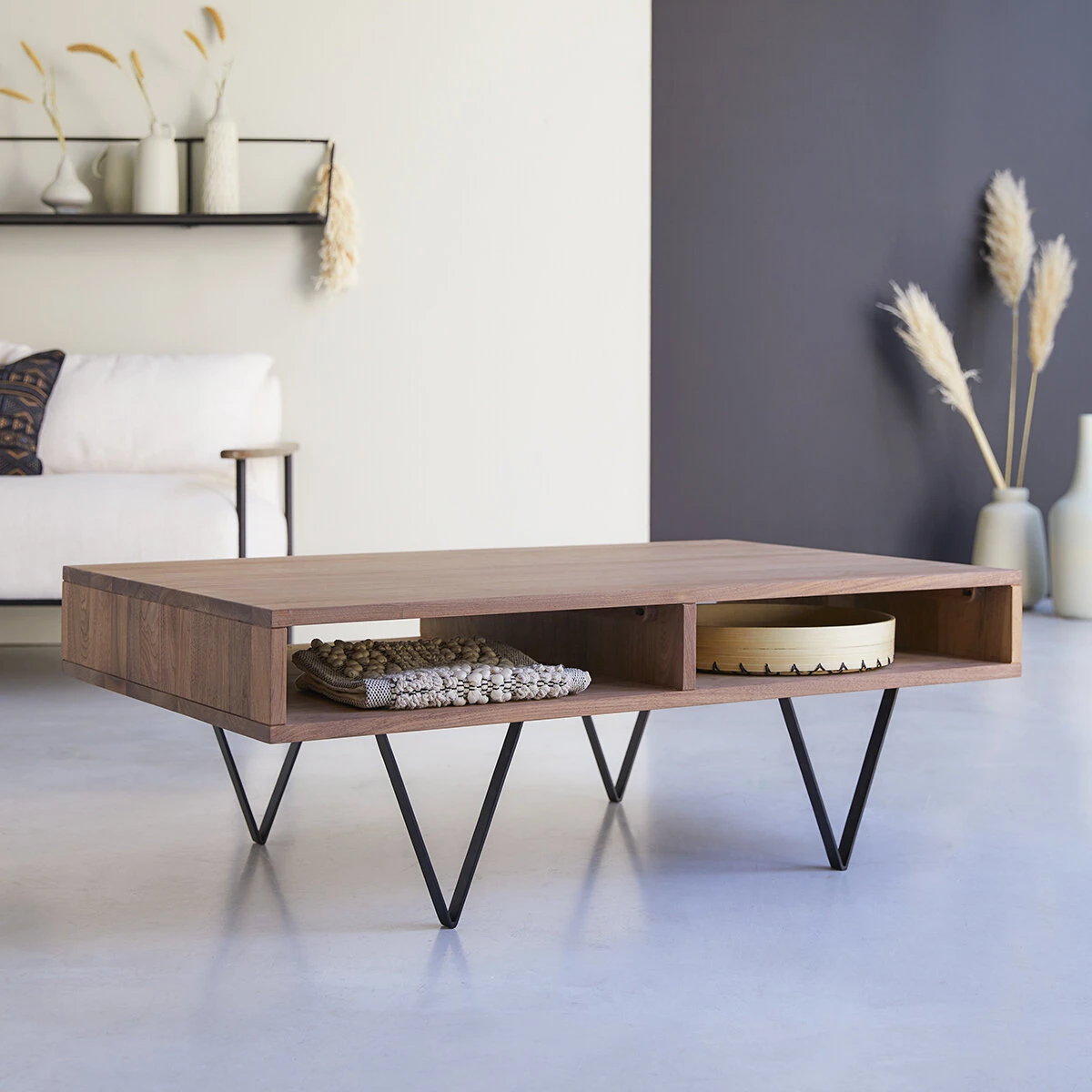 Une table de salon tellement visuelle qu’elle se suffit presqu’à elle-même : la table basse en noyer massif Metric. On aime tout chez elle : la sobriété de sa ligne, les deux niches qui permettent d’organiser magazines, télécommandes ou simplement quelques jolis objets déco… et ses pieds en métal très graphiques !