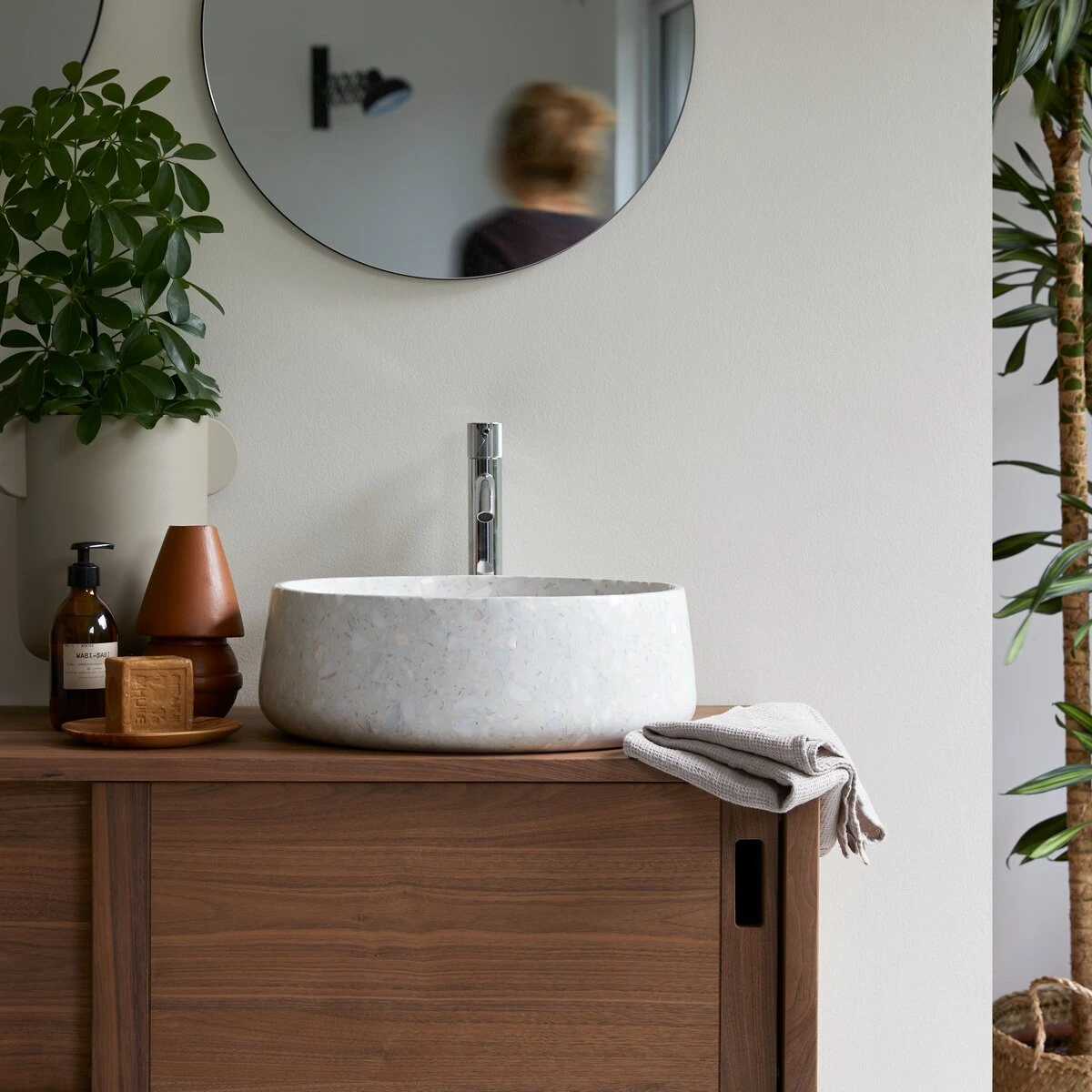 La vasque en terrazzo premium Milos, toute en rondeur et en douceur, offre le charme de la pierre naturelle et la facilité d’entretien d’un alliage bien pensé.