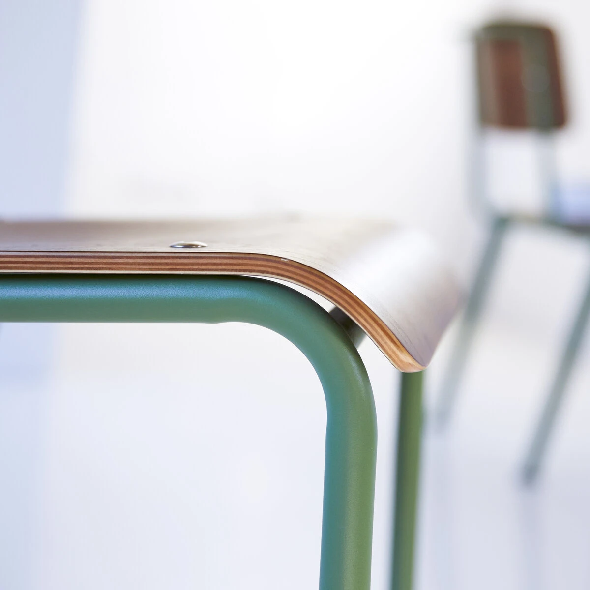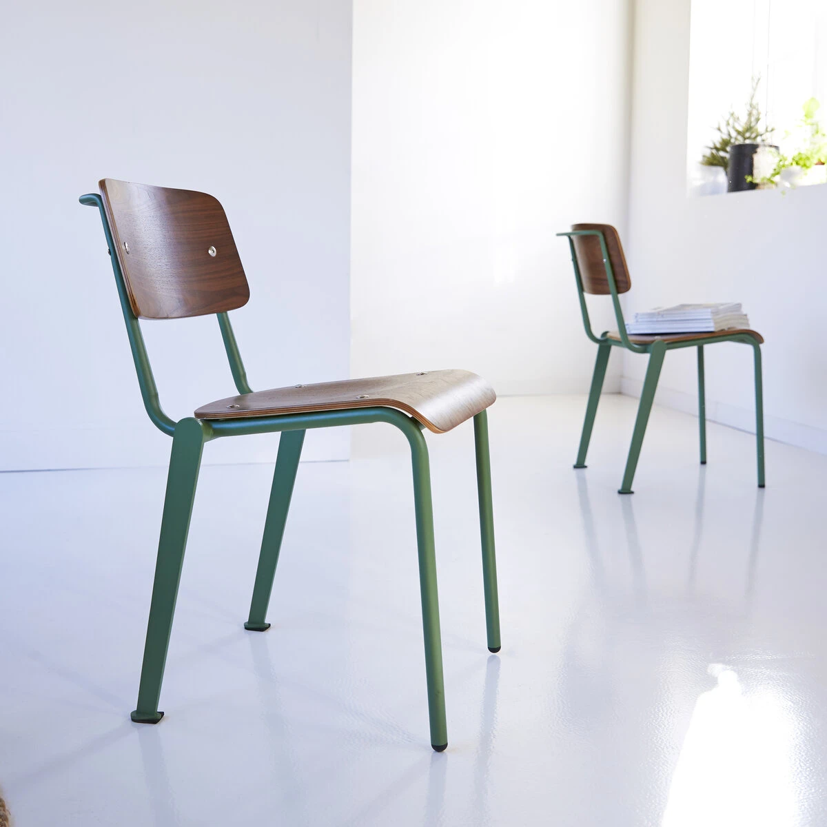 Réalisée en noyer et métal peint, vous aimerez son esprit revival : elle ressemble à s’y méprendre à nos sièges de collège et lycée ! Une bonne assise et une belle stabilité pour l’utiliser en chaise de séjour, de cuisine ou de bureau.