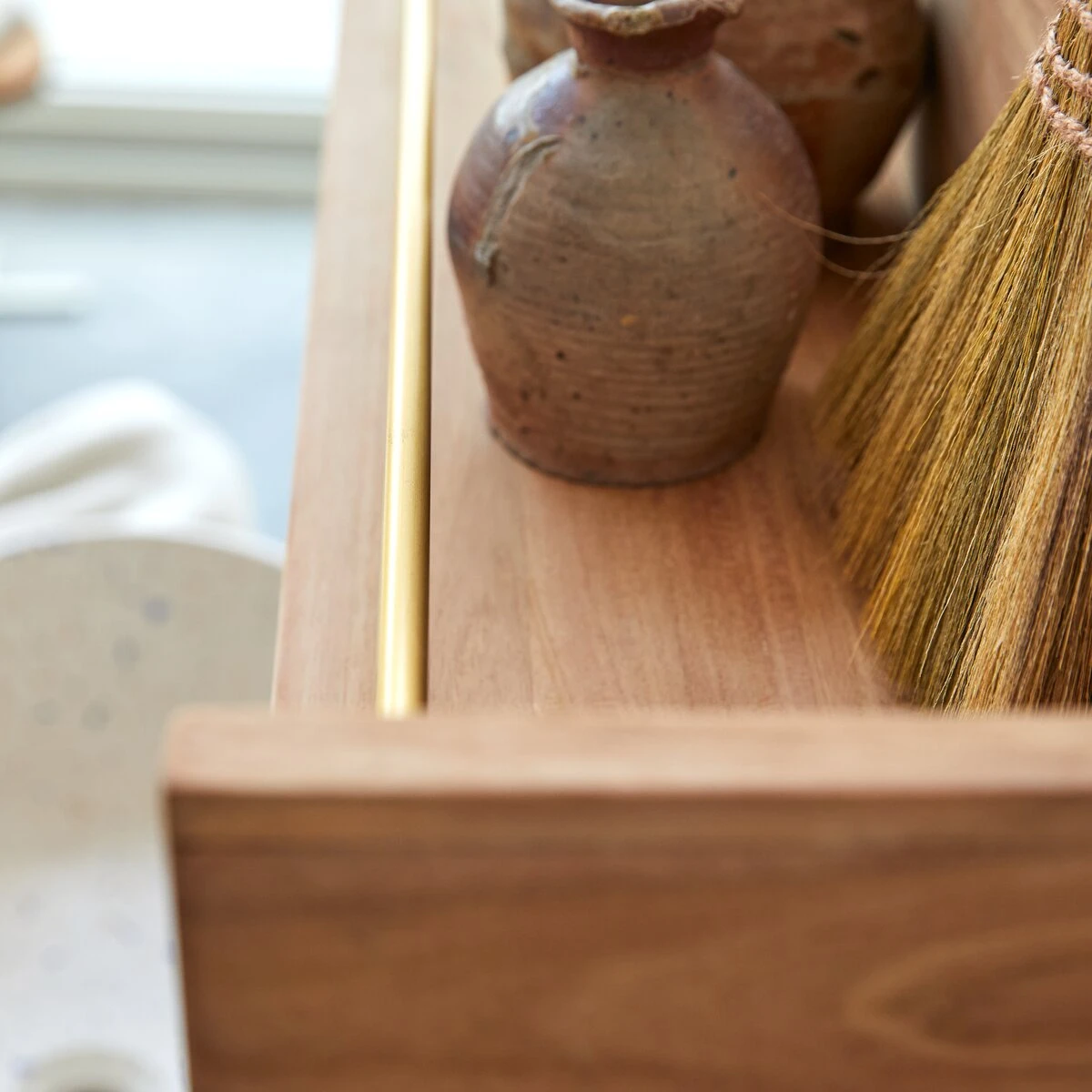 Le teck naturel associé au laiton raffiné composent un bel élément déco à placer dans la salle de bain pour recevoir les jolis flacons de toilette, la brosse, le miroir ou les pots déco…