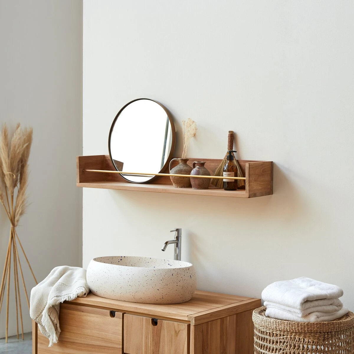 Beaucoup d’allure pour l’étagère murale de salle de bain en teck massif certifié FSC® et laiton Sasha 100, un petit meuble aussi pratique qu’élégant !
