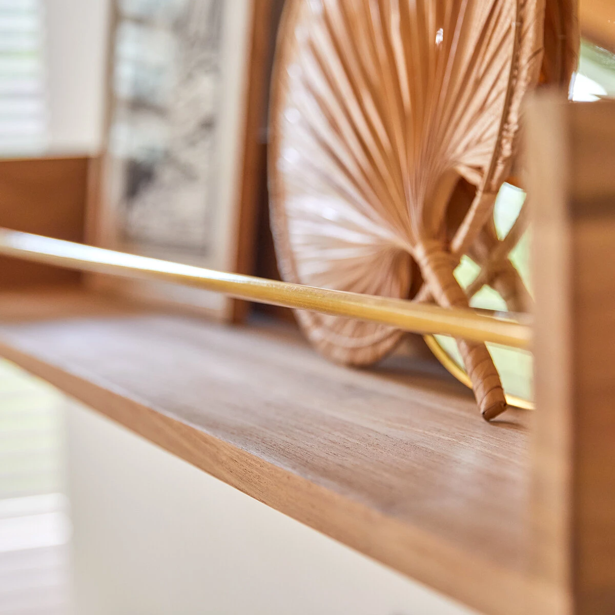 L’étagère murale en teck massif et laiton existe aussi en 60 cm. Elle se marie à la perfection aux meubles de notre gamme à l’esprit Naturel.