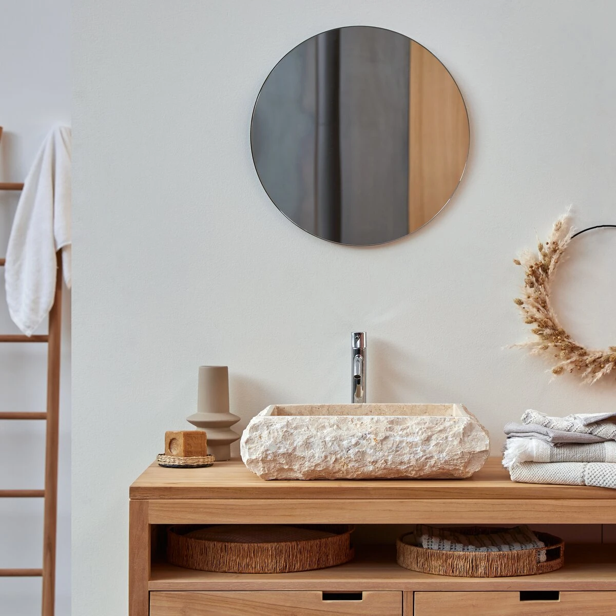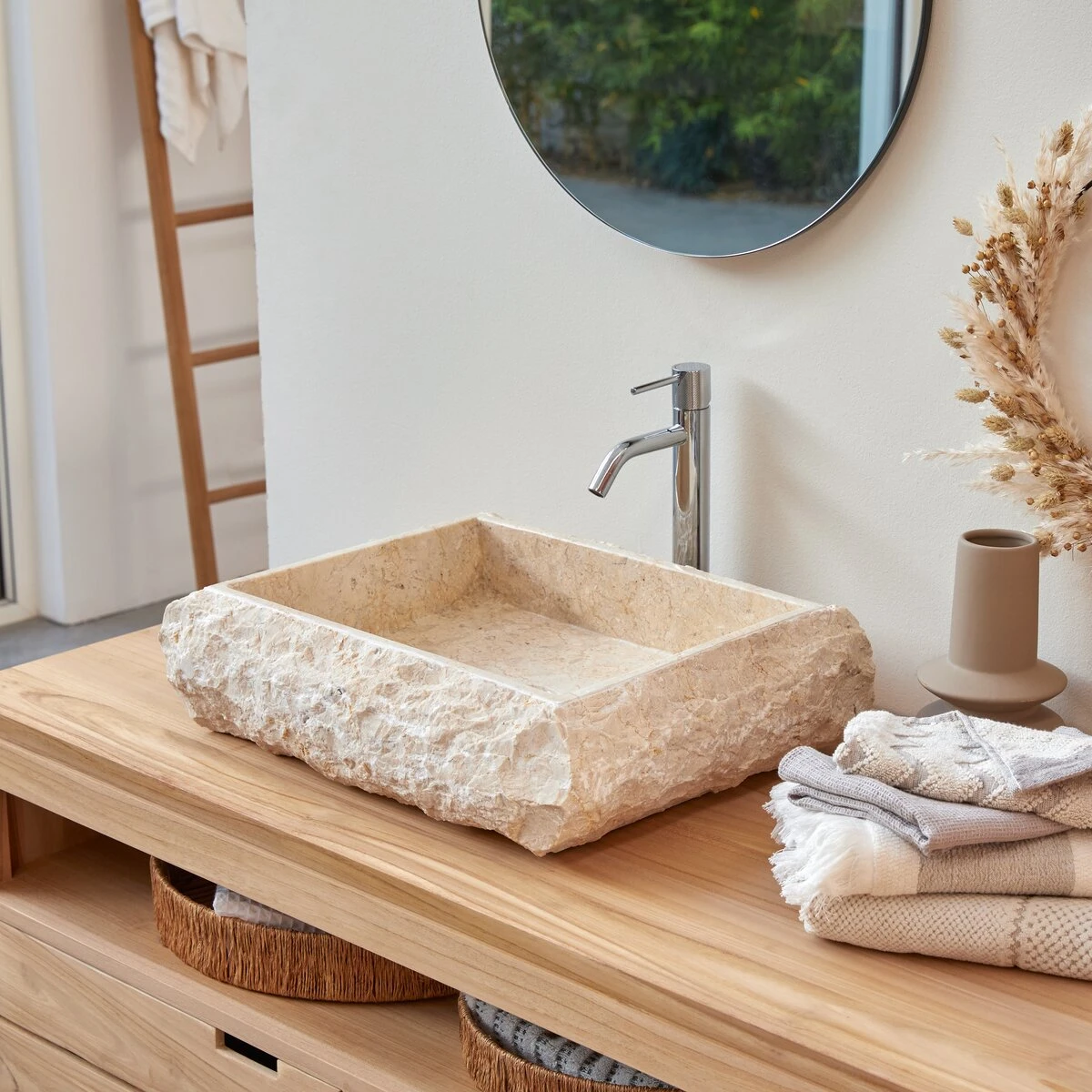 La vasque en marbre Scrula Slim cream, un trésor d’originalité et d’authenticité ! Taillée dans un bloc de marbre – une matière noble et à nouveau très en vogue dans les intérieurs contemporains – elle joue l’opposition des traitements : lisse à l’intérieur pour être facile à nettoyer, brut à l’extérieur pour laisser s’exprimer le côté nature du marbre.
