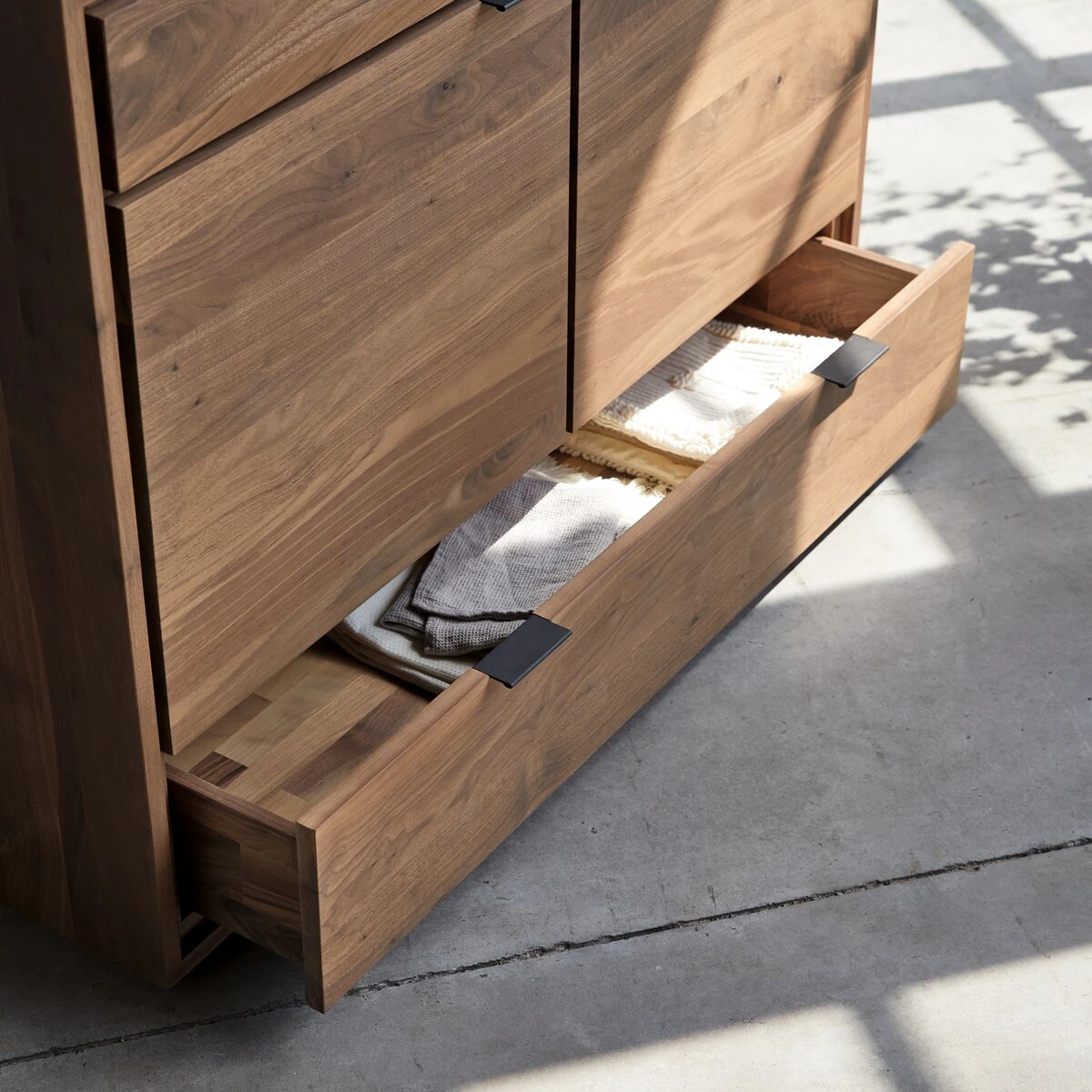 Le buffet en noyer massif Senson trouve naturellement sa place dans toutes les pièces de la maison : au séjour ou au salon, il reçoit avec élégance vaisselle et linge de maison, dans la chambre les vêtements pliés et le linge de lit, dans la salle de bain, tout le matériel de toilette comme les serviettes, draps et accessoires beauté. De qualité premium, ce buffet a été assemblé de manière traditionnelle. Il offre des tiroirs à coulisses invisibles et a bénéficié d’un traitement préalable à l’huile pour offrir un vrai confort d’entretien.