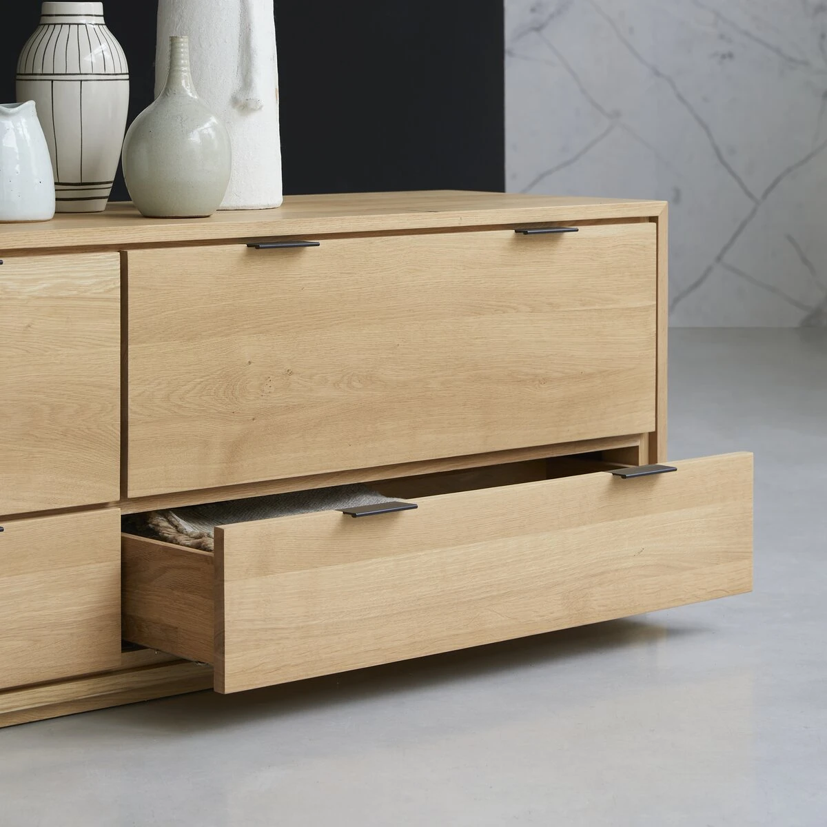 Dans une version ultra-contemporaine, on peut le détourner en buffet bas grâce à son design « bloc » allégé par un cadre fin. Quelle que soit l’utilisation qu’on lui dédie, il sera le point central de la décoration de votre pièce ! Sa sobriété lui permet d’être associé à tout style de déco : il sera donc aussi parfait conjugué aux autres meubles de la collection Senson Oak qu’à vos meubles existants. A noter, les grands tiroirs bien profonds et les portes abattantes très pratiques.