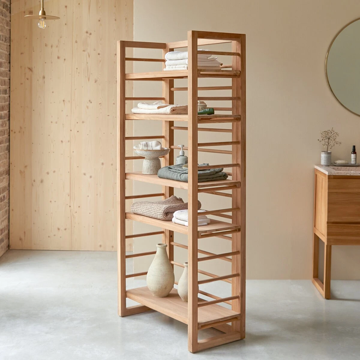 L’étagère en teck Sera (80 x 180 cm) organise tout ce dont on a besoin à l’heure de la toilette. La douceur de son coloris lui permet de se marier à tous les types de déco. Il vous suffira donc de l’ajouter à votre salle de bain existante pour ranger serviettes de bain ou de toilette, accessoires, produits de beauté et autres shampoings.