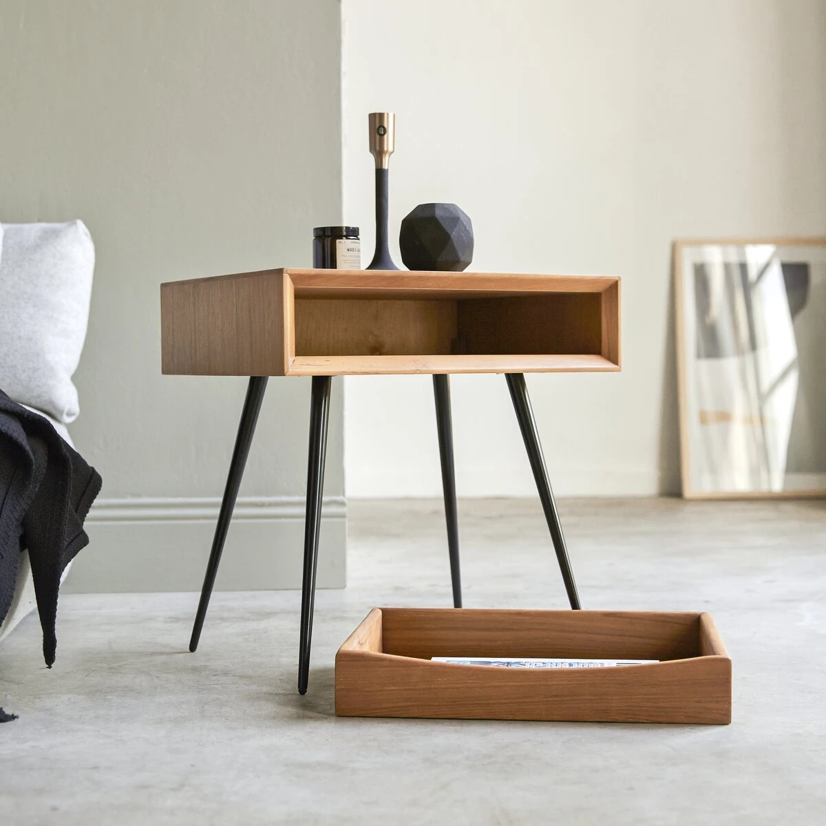 Beaucoup de charme et de personnalité pour le chevet en teck Simen ! On aime son design d’inspiration scandinave, la blondeur de son bois, le minimalisme de ses lignes. Idéal pour ranger tout ce qu’on aime garder à portée de main près du lit : magazines, pilules, lunettes, livres, télécommandes…