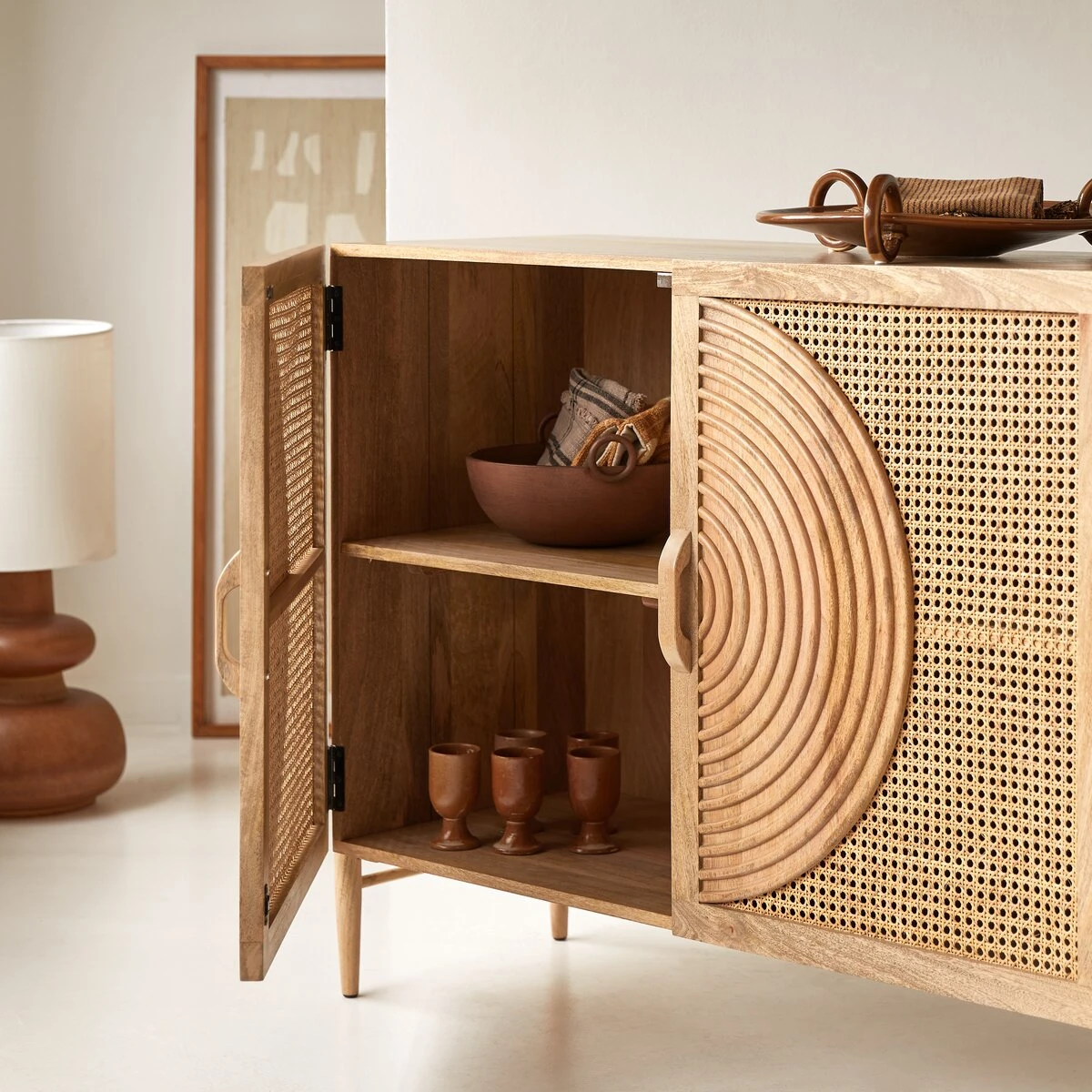 Comme une invitation au voyage, le buffet Sina en manguier massif et rotin conjugue originalité et élégance teintée d’exotisme ! Ce n’est clairement pas le meuble qu’on retrouve chez tout le monde : joué solo, il réveille votre décoration intérieure… associé à nos autres meubles de la collection Sina, comme le banc TV ou la commode, il affiche de manière assumée sa personnalité néo-ethnique. On aime la combinaison des deux matières authentiques et l’étonnant décor qui se révèle en totalité quand les deux portes sont fermées. On aime aussi sa blondeur qui autorise de nombreuses associations.