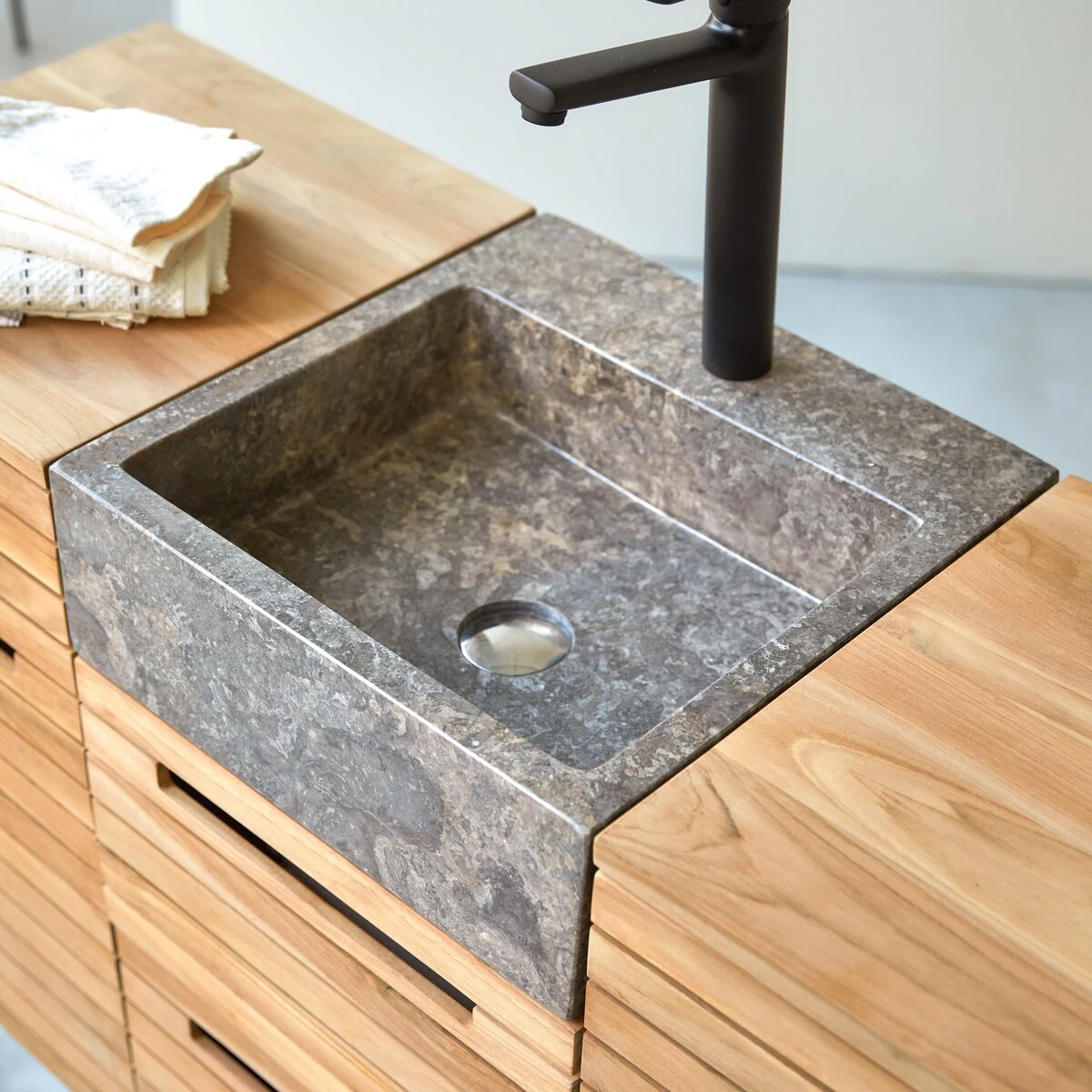 Un design très tendance, l’élégance naturelle du teck massif imperméable toujours d’actualité et le raffinement du marbre : le meuble en teck et vasque en marbre Slats 122 a vraiment tout les atouts d’un meuble dédié à un espace de détente !