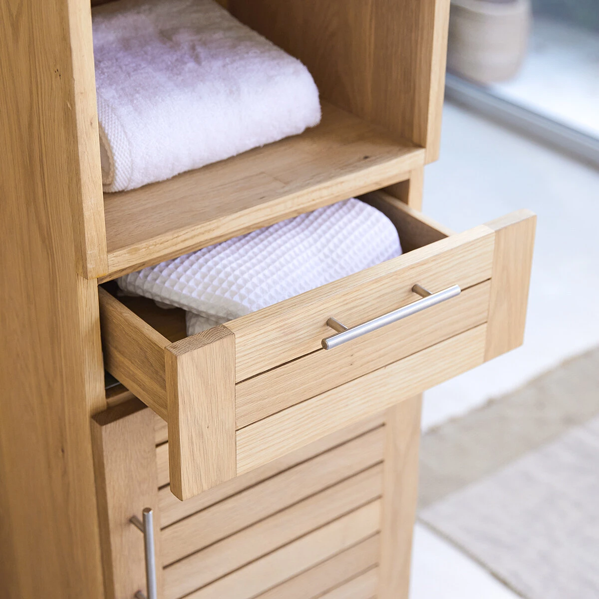 La colonne en chêne Soho prend très peu de place au sol pour une capacité de rangement maximale : 1 placard fermé par une porte à façade lattée + 1 tiroir + 3 niches… De quoi répartir astucieusement linge de toilette, accessoires et produits de beauté !