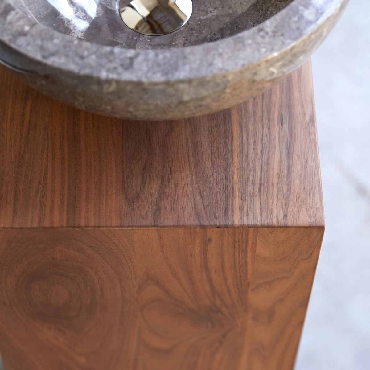 Le meuble sous-vasque en noyer massif Stelle complète avec beaucoup de réussite les autres pièces de notre collection de bain Stelle. Il vous est également proposé en teck massif.