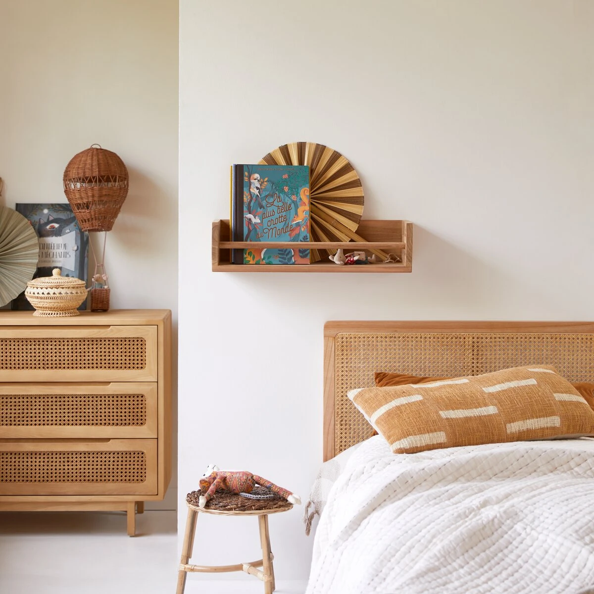 L’étagère murale en teck massif certifié FSC® Ugo 60 accompagne les rêves des enfants. Idéale pour leur permettre de ranger la BD en cours, le livre commencé ou les petits trésors qu’ils aiment regarder avant de dormir, elle s’installe à proximité du lit pour aider l’enfant à gérer lui-même son rituel d’endormissement. Les plus grands apprécieront d’y ranger le matériel scolaire au-dessus du bureau.