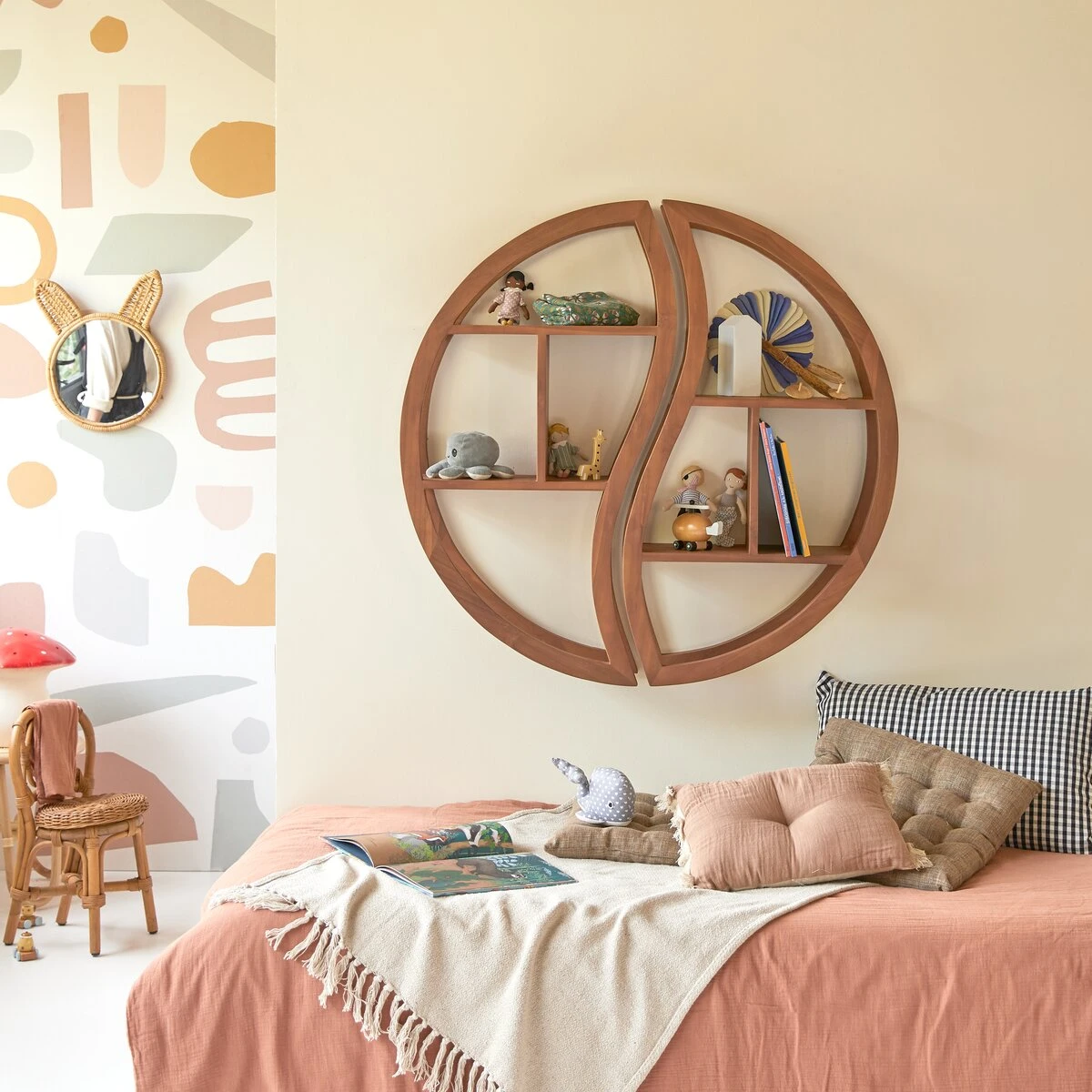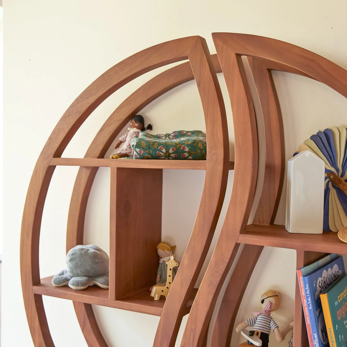 Au-dessus du bureau ou à proximité du lit, l’étagère en teck massif Ying Yang est comme une petite musique apaisante et relaxante dans la chambre à coucher : elle permet aux enfants de se raconter de jolies histoires d’horizons lointains et de rêves les plus fous… Sa forme évoque le symbole « yin yang » qui invite à l’équilibre et à la zénitude : les enfants apprécieront d’y exposer leurs créations préférées, leurs livres ou leurs jeux de société…